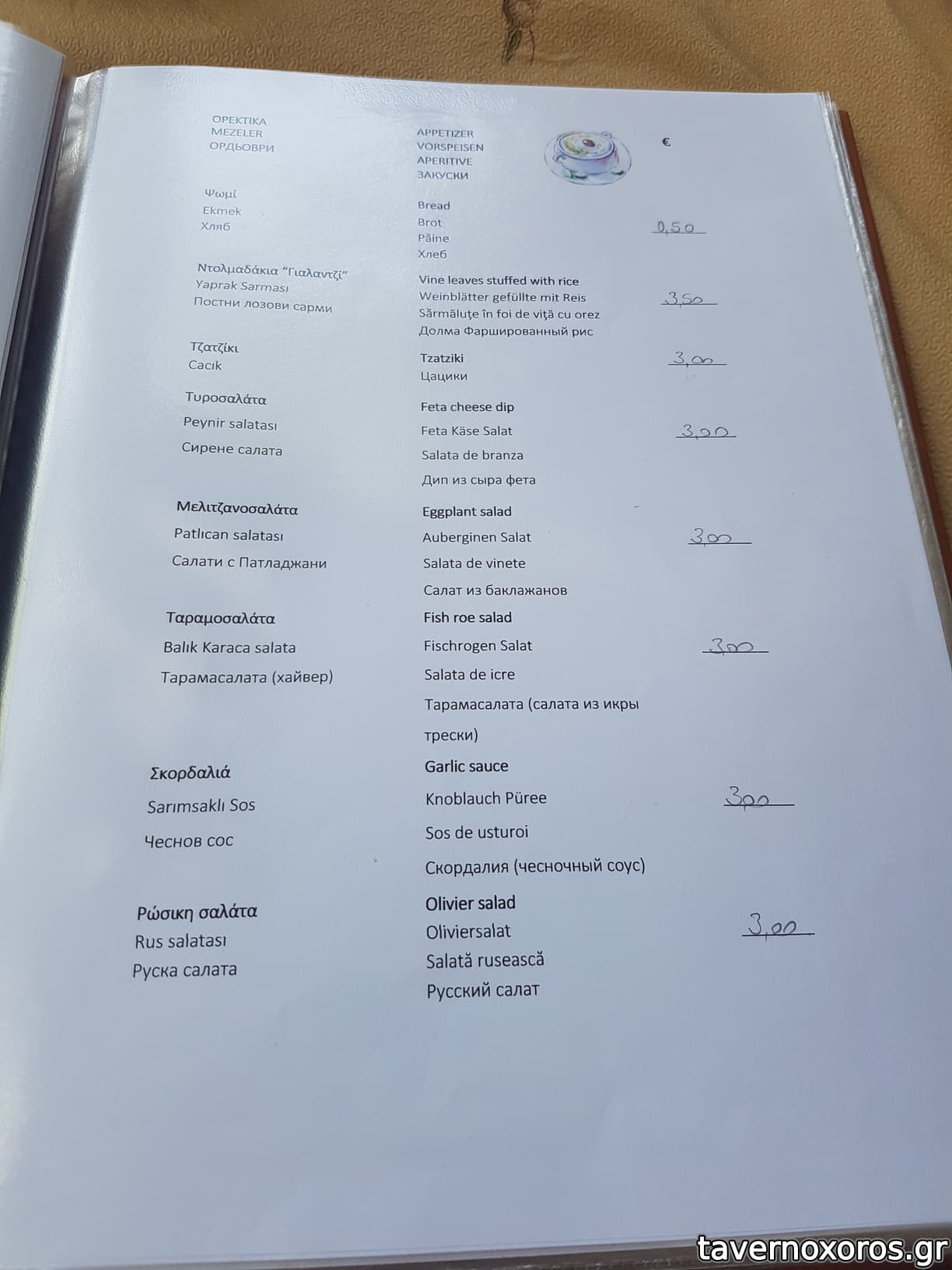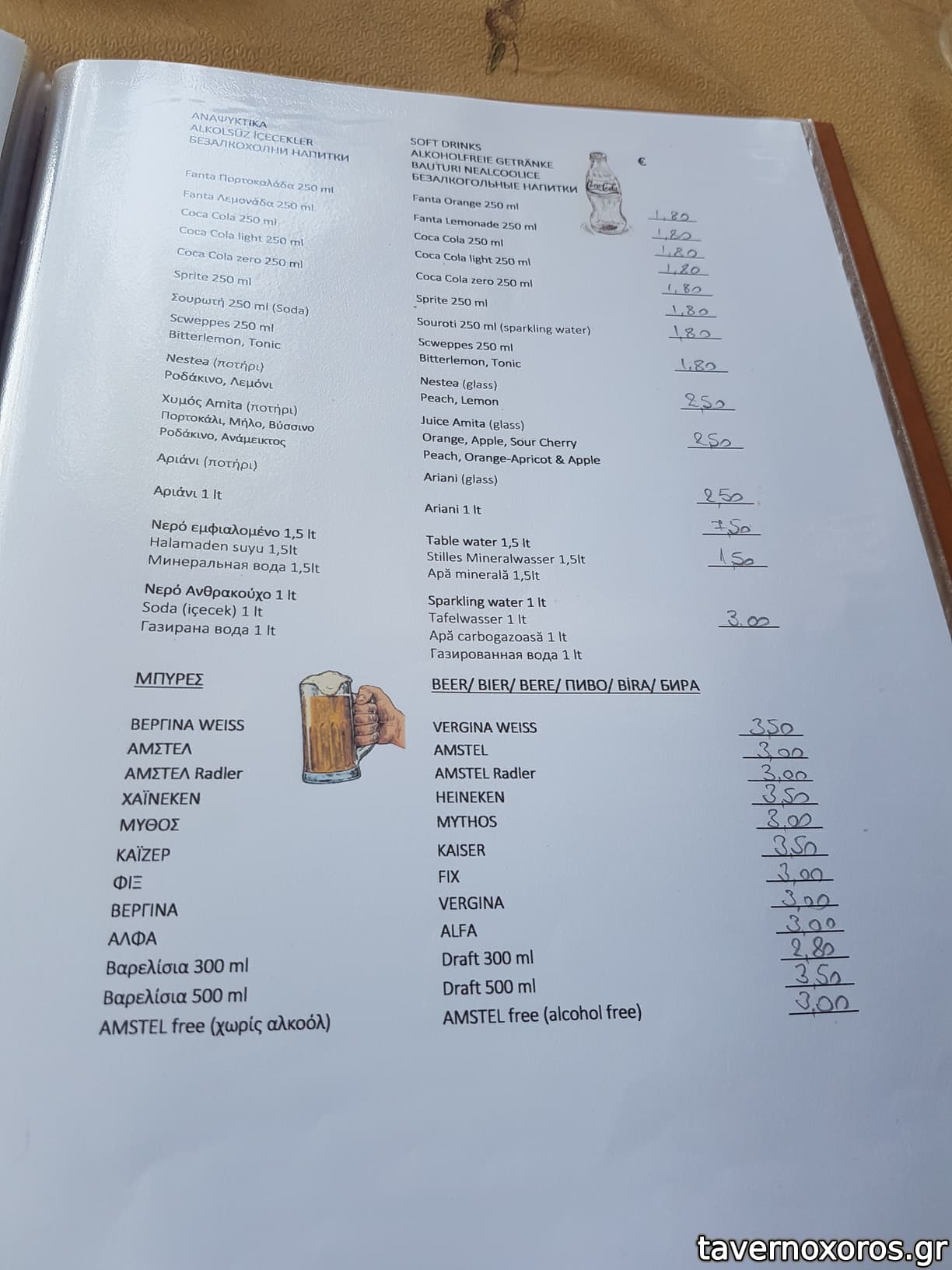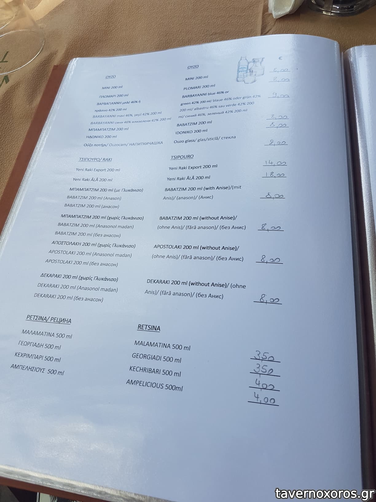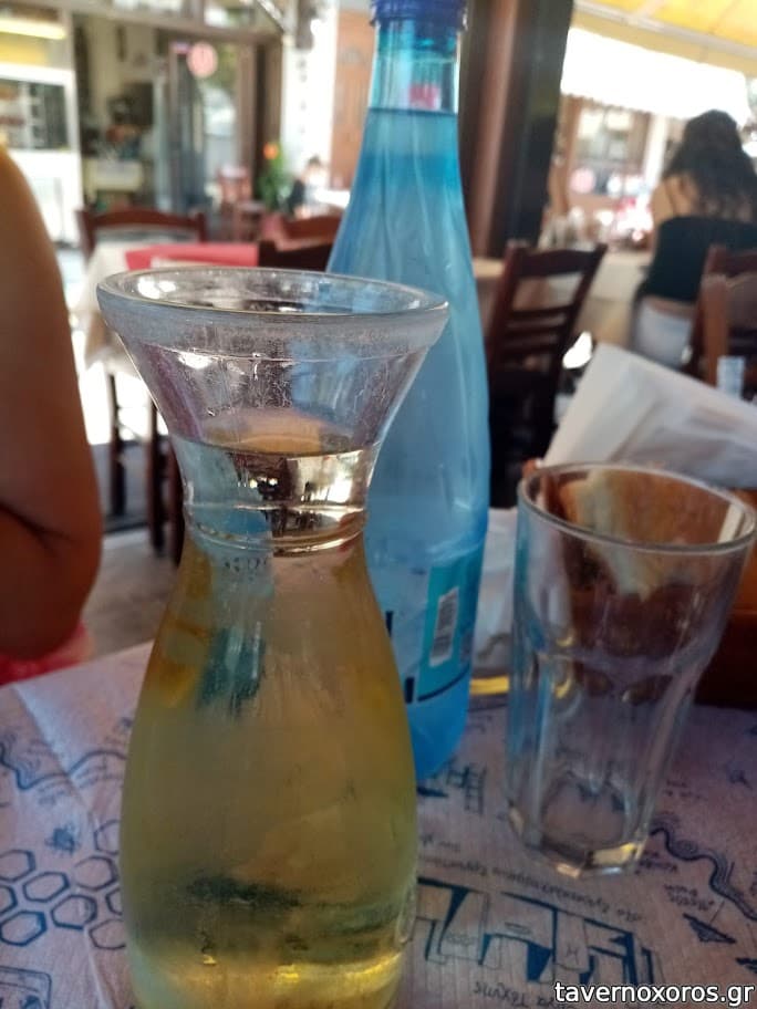 Χαρακτηριστικά θα αναφέρω ότι μας έφερε εμφιαλωμένο νερό και όταν του ζητήσαμε νερό βρύσης σε κανάτα μας είπε ότι απαγορεύεται, ενώ τις προηγούμενες ημέρες σε άλλες ταβέρνες μας φέρναν νερό σε κανάτα, και σε δυο διαφορετικά ξενοδοχεία που μέναμε μας διαβεβαιώναν ότι το νερό στο νησί πίνετε και μάλιστα είναι πολύ καλό!