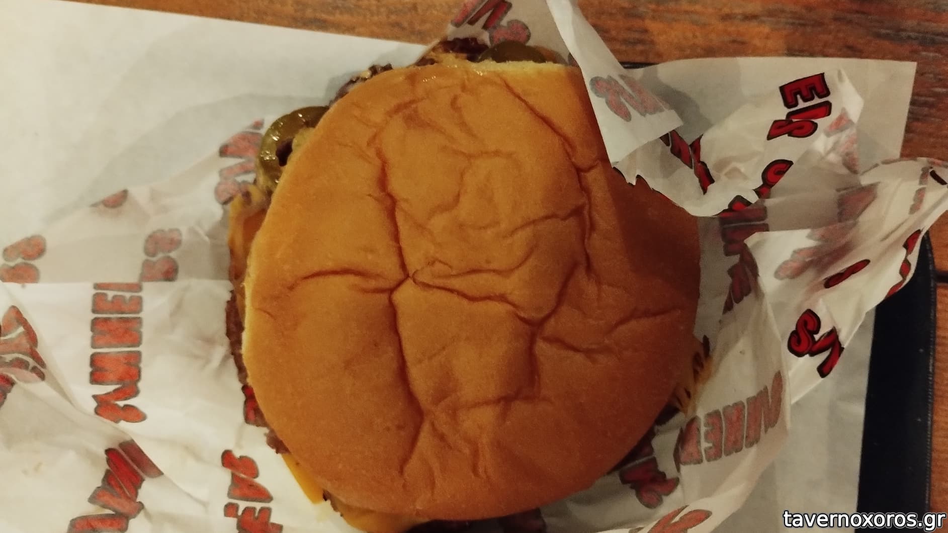 Burger απλό double με προσθήκη πίκλες. Στον κατάλογο γράφει ότι έχει μόνο κέτσαπ και μουστάρδα.