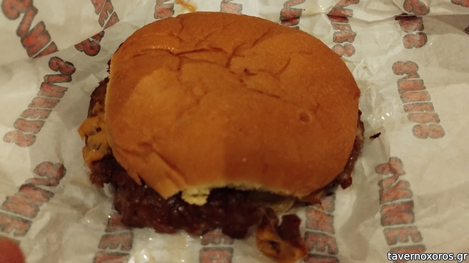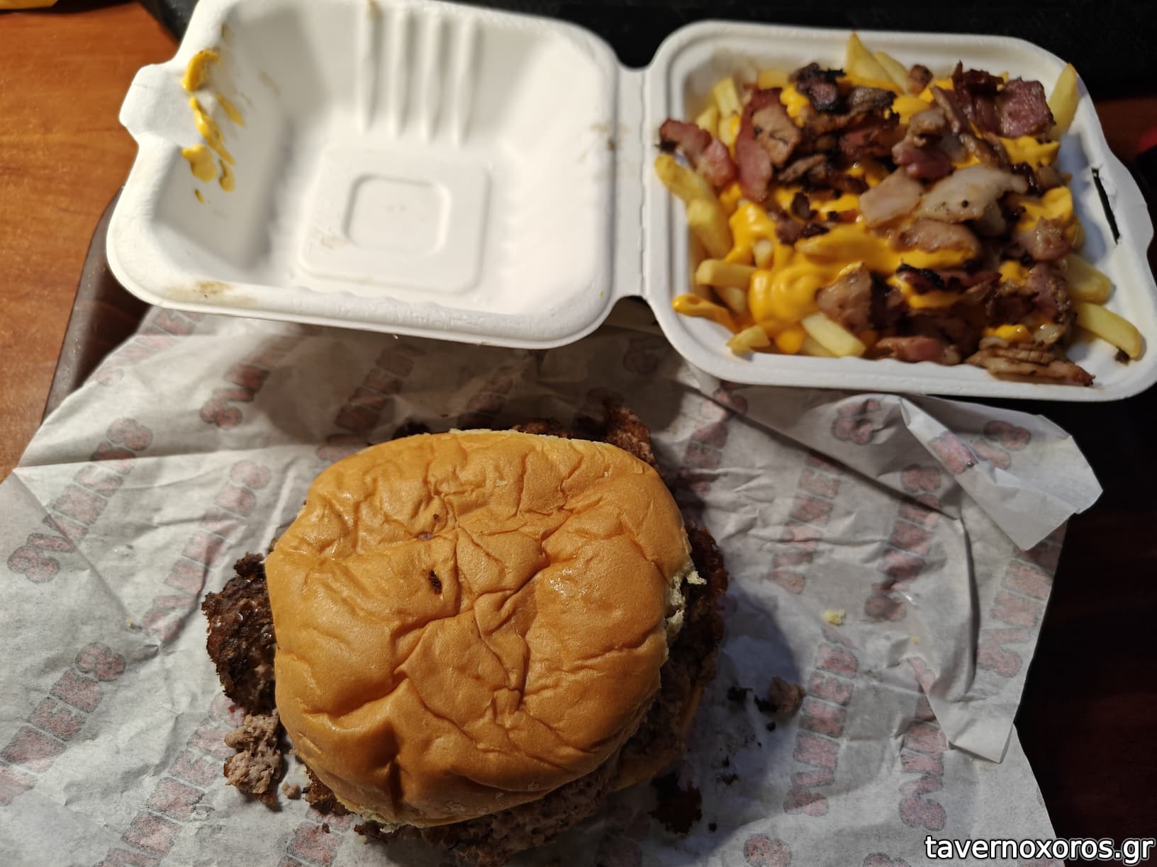 Το burger πατημένο και μικρούτσικο. Ψωμάκι τύπου μπριός, καλό. 2 μπιφτέκια smashed, τα οποία όμως διαλύονταν. Το κέτσαπ δεν το βρήκα ποτέ, την μουστάρδα δεν την κατάλαβα.