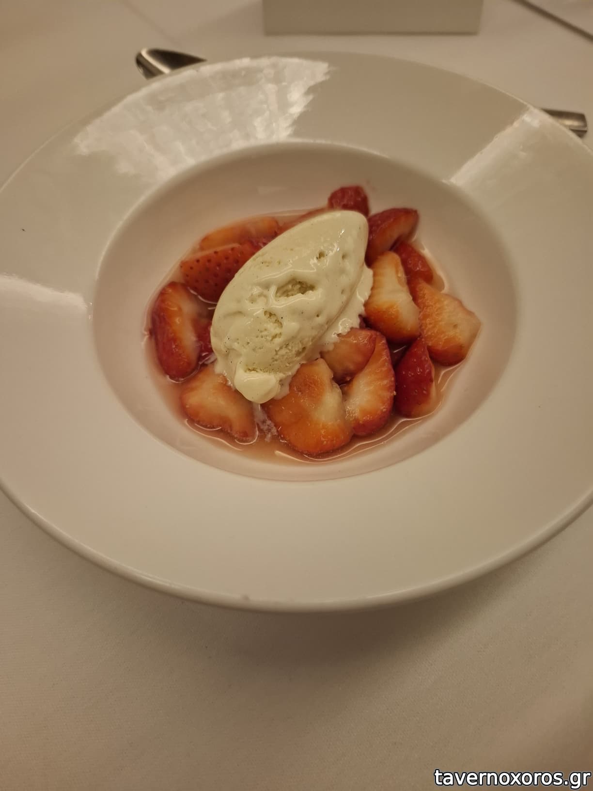 Strawberry 'soup' with vanilla ice cream