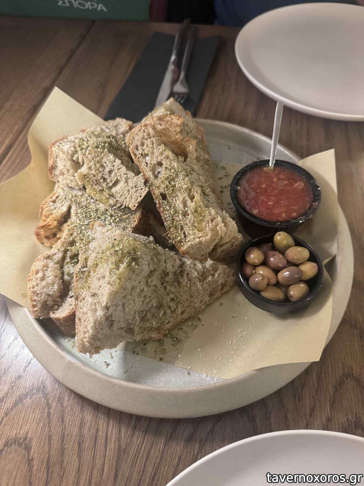 Ψωμί, ελιές και τριμμένη ντομάτα (καλωσόρισμα, πολύ καλό)