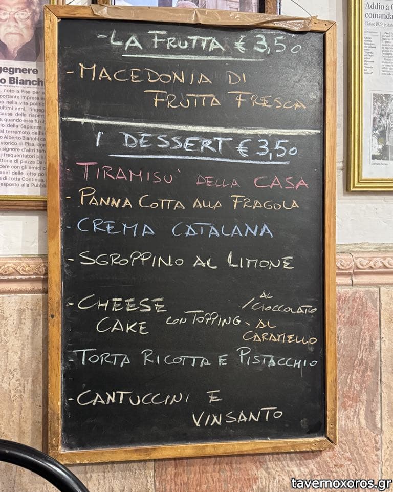 Οι τιμές έχουν κολλήσει σε άλλες εποχές με τα primi στα 6 και τα secondi στα 8 ευρώ! Επίσης έχει διάφορους συνδυασμούς που το κάνουν ακόμα φθηνότερο. Αξίζει να δοκιμάσει κανείς και το ponce alla livornese, ένα γλυκό μιξ καφέ με αλκοόλ (νομίζω ρούμι) τύπου Irish coffee που είναι χαρακτηριστικό του γειτονικού Livorno.