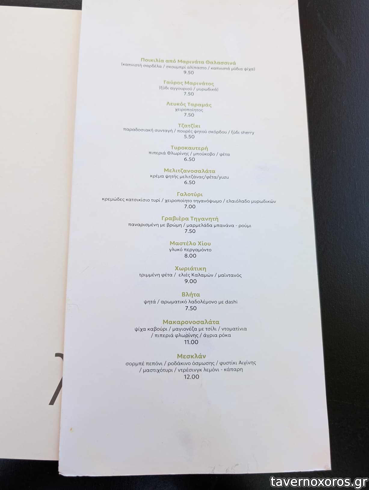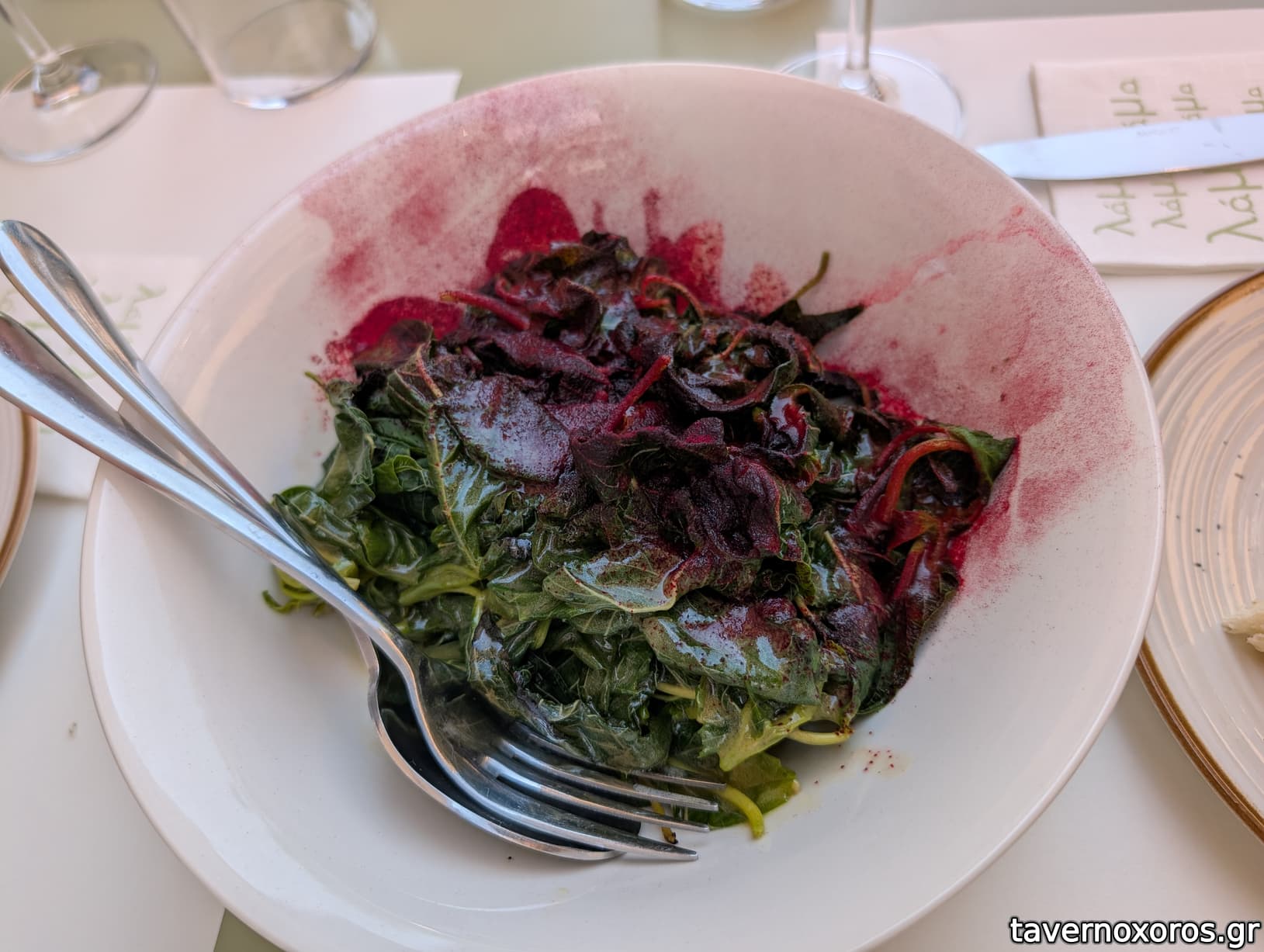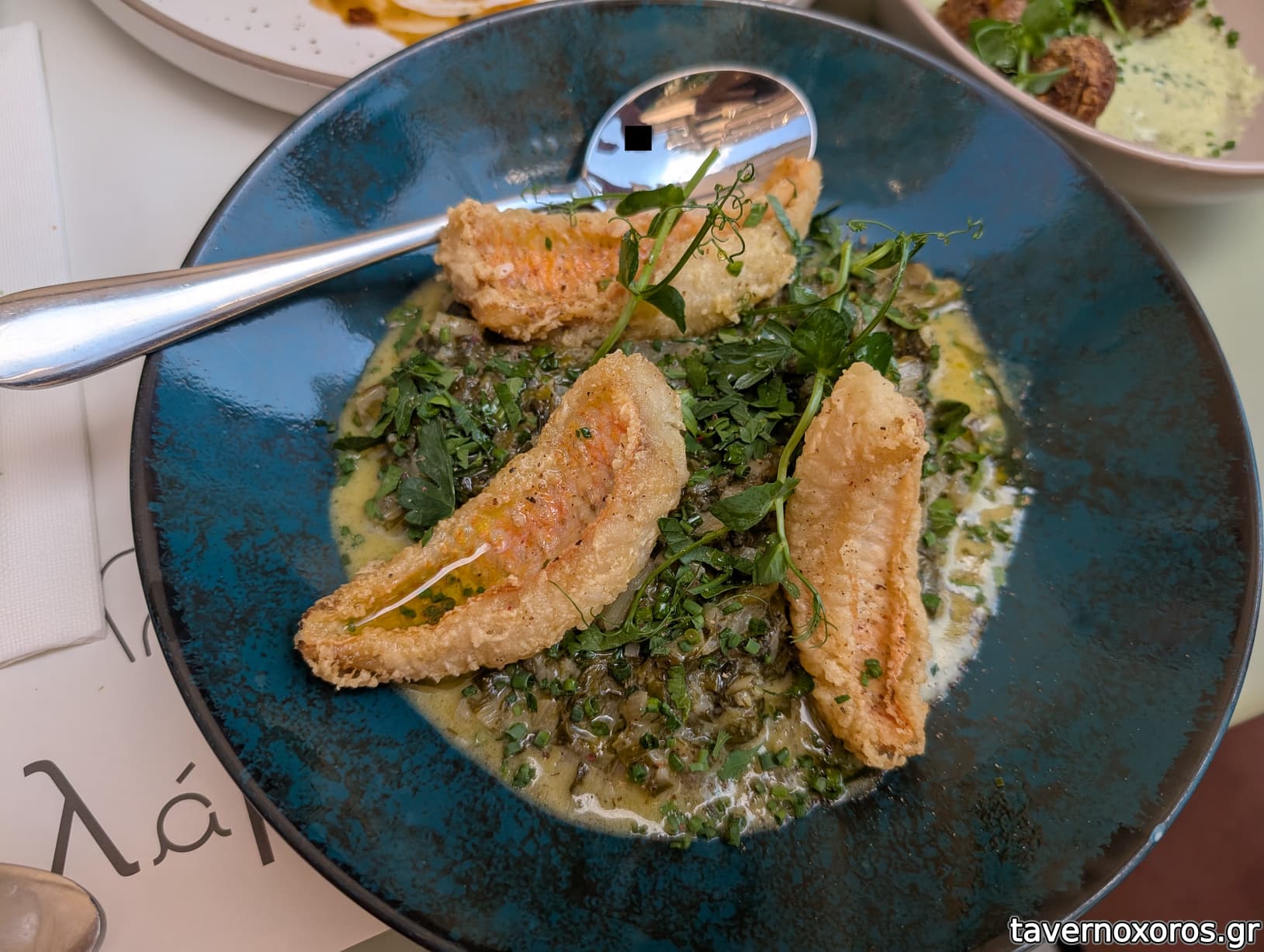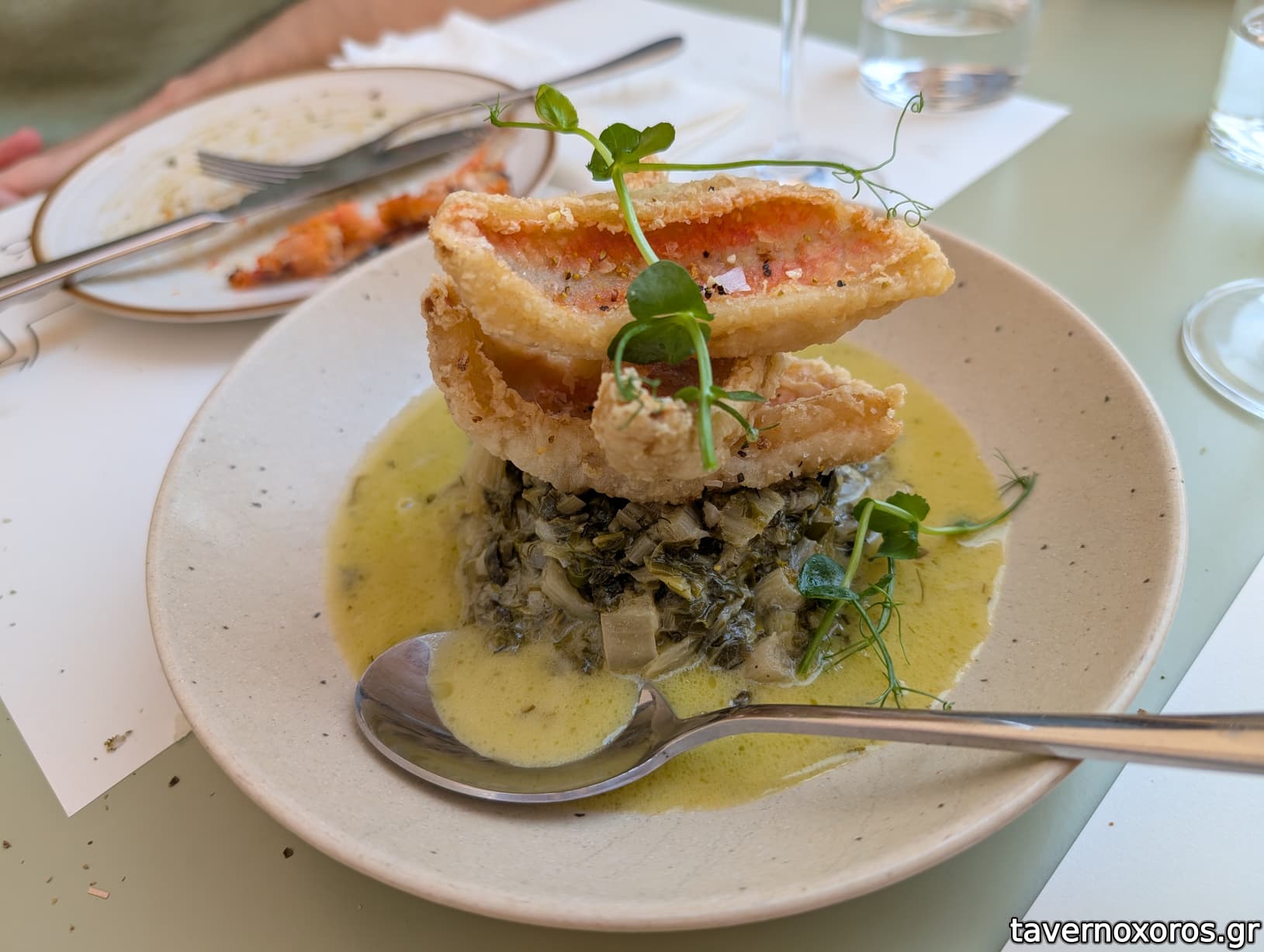 "Μπαρμπούνι τηγανητό φρικασέ, αβγολέμονο με ζωμό ψαριού, χόρτα εποχής" (ανάλατο, άνοστο)