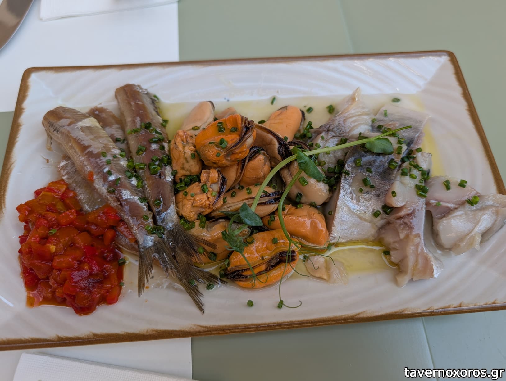 Ποικιλία από μαρινάτα θαλασσινά: καπνιστή σαρδέλα, σκουμπρί αλίπαστο, καπνιστά μύδια ψίχα (πολύ μέτρια)