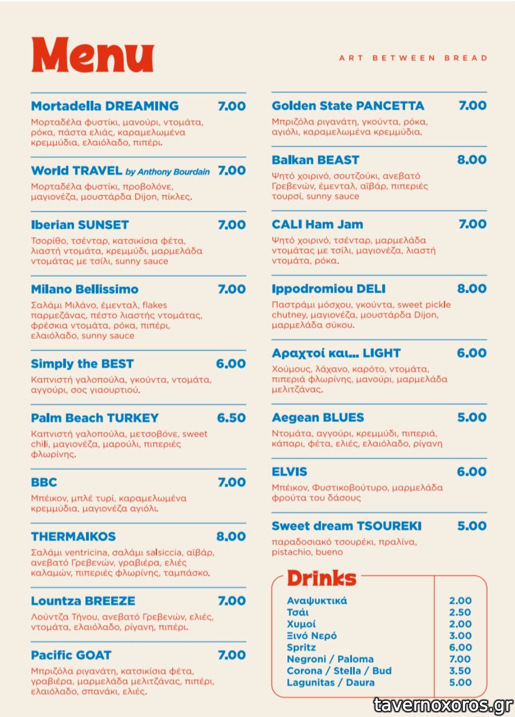 Έχει αρκετά μεγάλο μενού με σάντουιτς με κάποιες ενδιαφέρουσες επιλογές, κάποιες χαώδεις και άκυρες. Γενικά όμως τα υλικά είναι ποιοτικά και premium (πχ τσορίθο, παστράμι κλπ). Το πατάει στην τοστιέρα το σάντουιτς, αν θέλεις το παίρνεις και χωρίς πάτημα, τα ψωμιά δυο φορές που πήρα ήταν ολόφρεσκα.