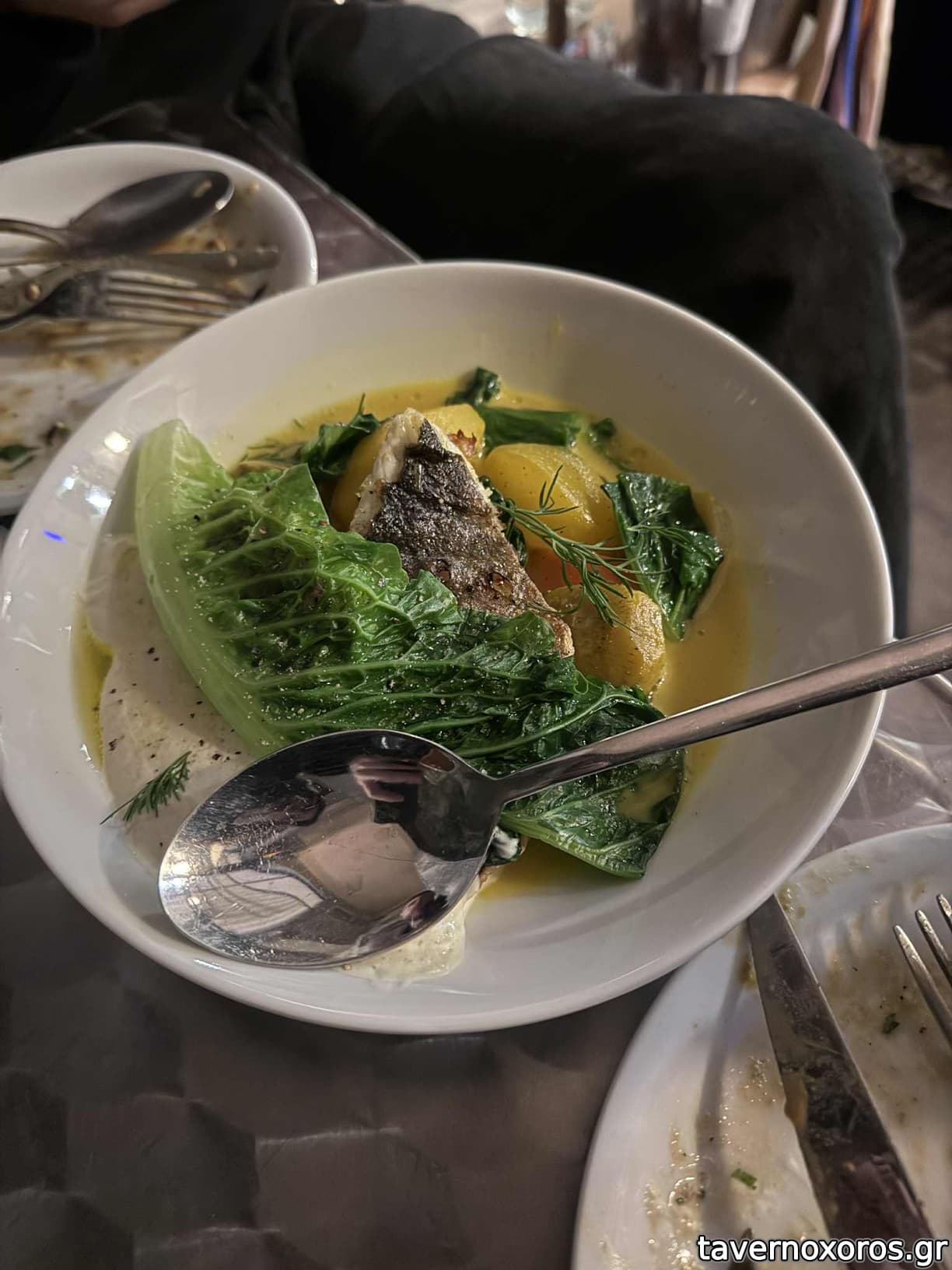 Λαυράκι φρικασέ, αυγολέμονο, σαφράν (πολύ καλό, πολύ νόστιμη η σάλτσα)