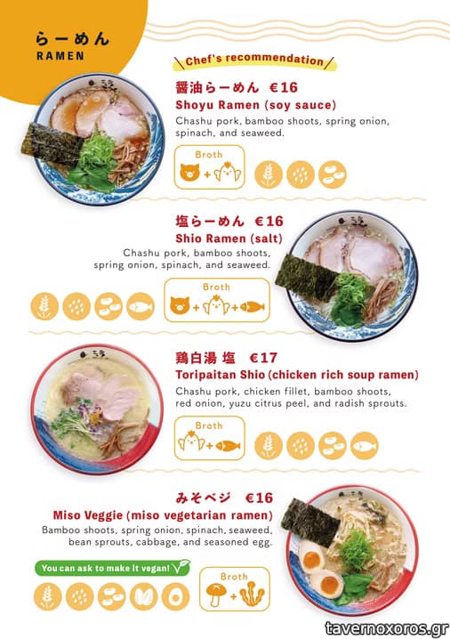 2) το toripaitan με παχύρρευστο ζωμό όπου κυριαρχεί το κοτόπουλο, και