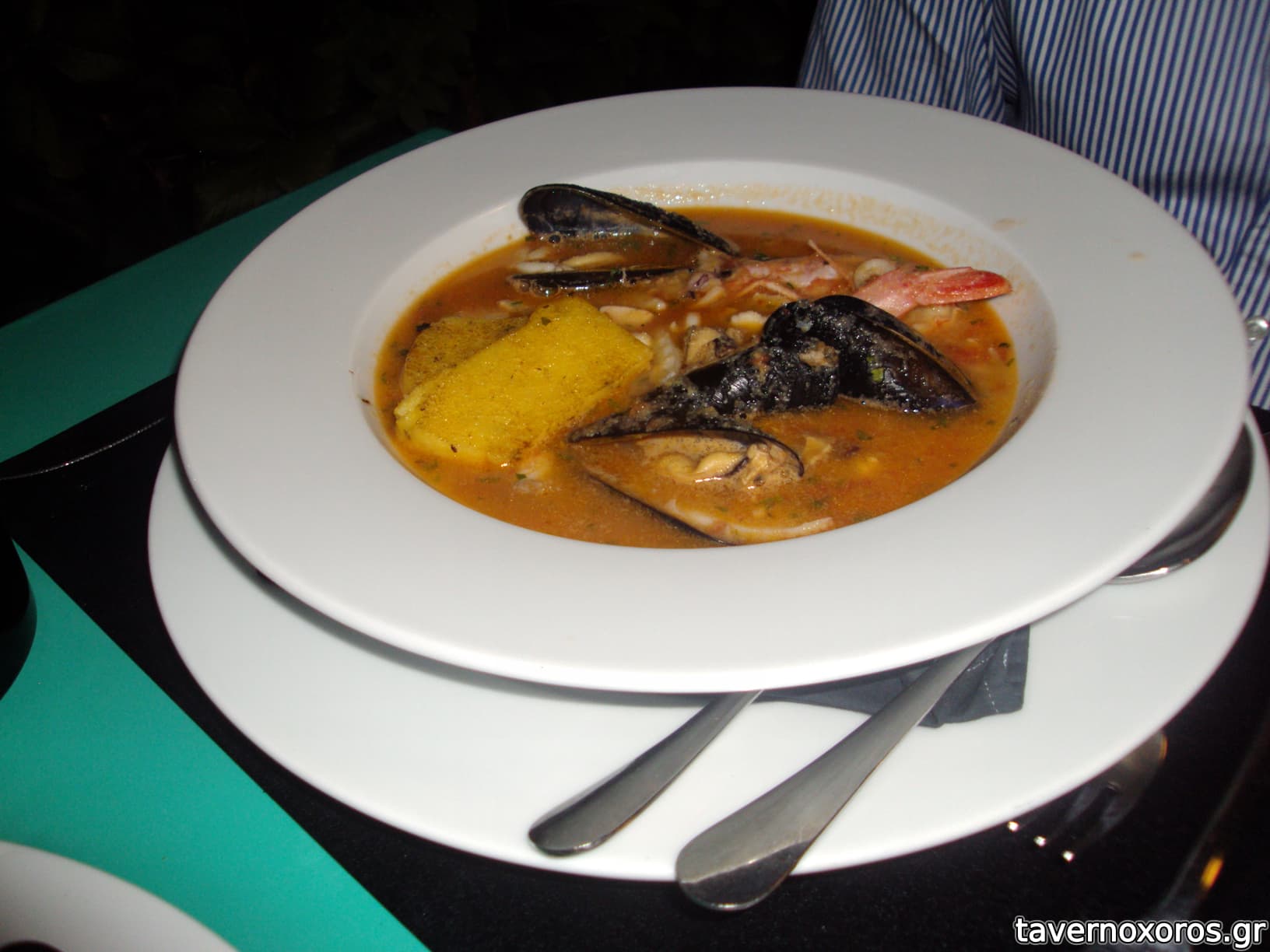 Ψαρόσουπα με διάφορα θαλασσινά και τηγανητή πολέντα
