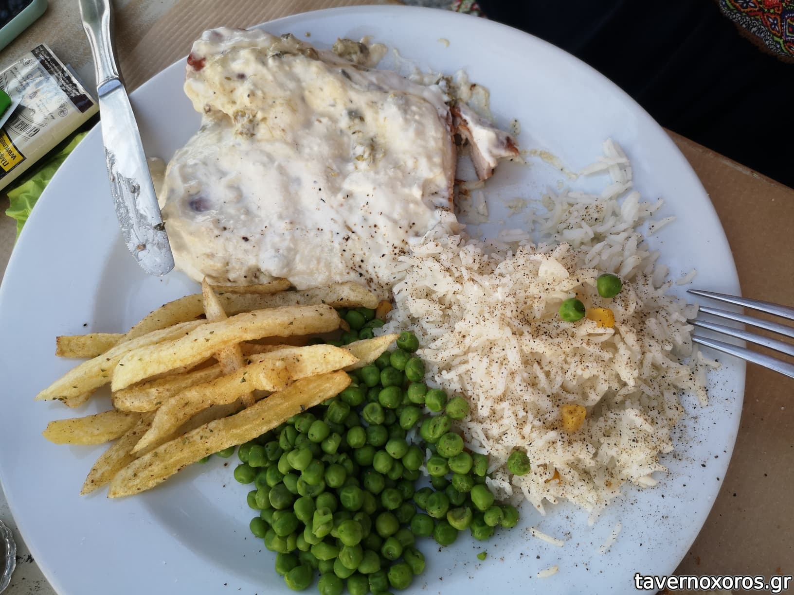 Βρίσκεται στην είσοδο της Χώρας, που σημαίνει ότι έχει λίγη φασαρία απο αυτοκίνητα και λεωφορεία, ειδικά όσο πλησιάζει η δύση του ήλιου. Παρόλα αυτά, έχει εξαιρετική θέα προς τη βόρεια πλευρά του νησιού και αν καβατζώσεις τραπέζι που δεν είναι δίπλα στο δρόμο, είσαι οκ. Στα του φαγητού, διεκπεραιωτικά πράγματα, χωρίς ιδιαίτερη φαντασία στον κατάλογο.