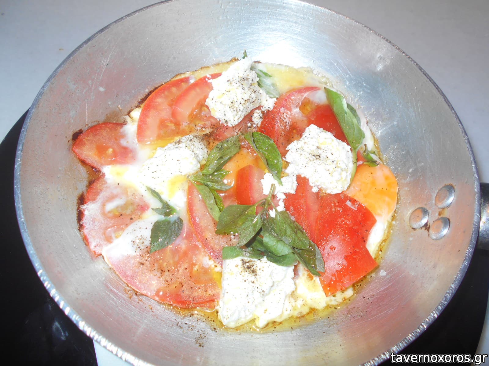 Σαγανάκι αβγά, μοτσαρέλα βουβαλίσια, ντομάτα, δυόσμος