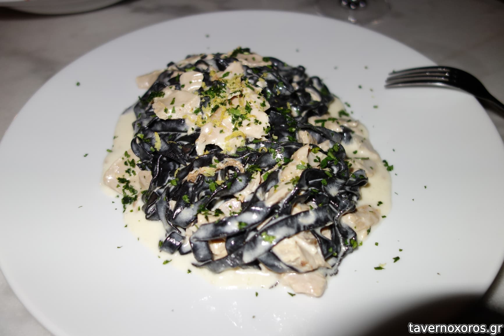 "Χειροποίητες μαύρες ταλιατέλες με τόνο και κρέμα λεμονιού" (οι ταλιατέλες πολύ καλές, η κρέμα λεμονιού όμως ήταν υπερβολικά έντονη και το χαλούσε)