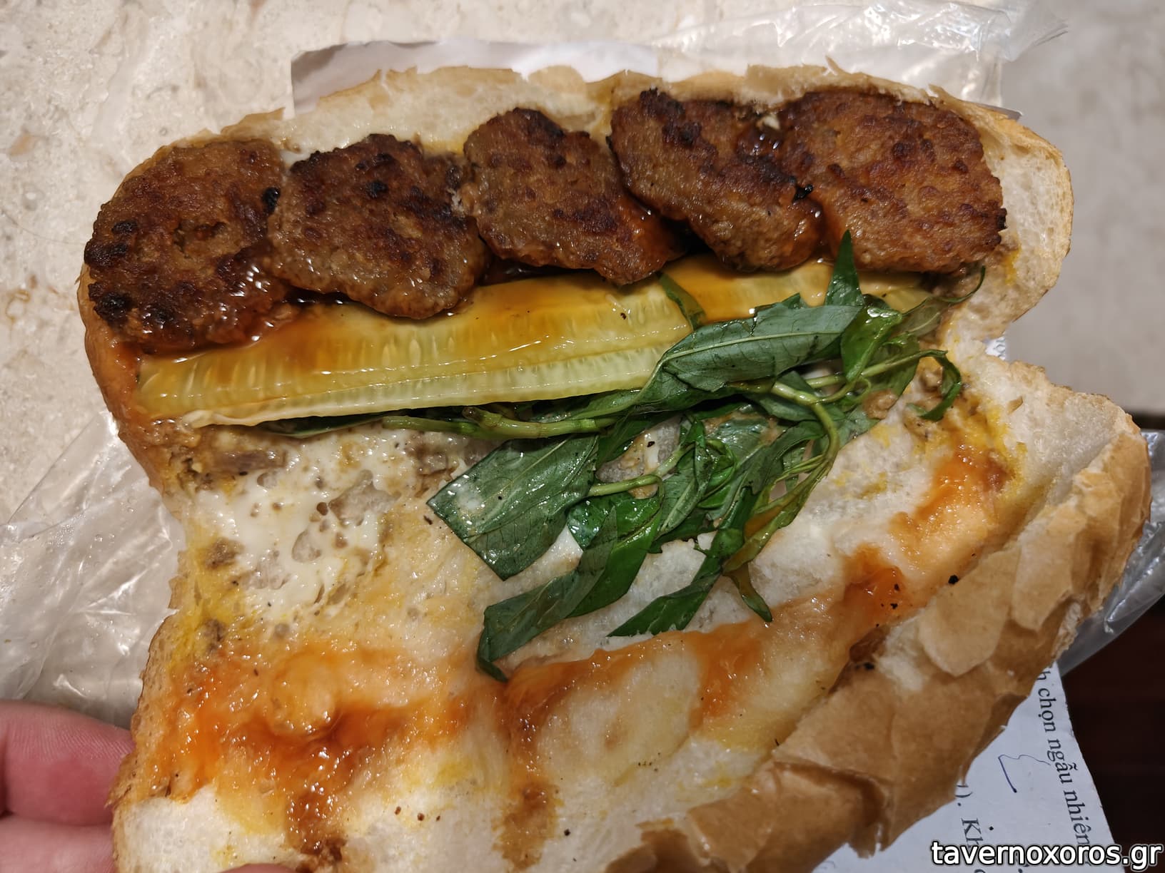 Μαζί με τα 5 μπιφτεκάκια έβαλε αγγούρι, 2-3 σως και αυτήν την πρασινάδα που χρησιμοποιούν κατά κόρον αλλά προσωπικά σιχαίνομαι. Μετά από ψάξιμο, μάλλον πρόκειται για το Rau Răm το οποίο ονομάζεται και Βιετναμέζικος κόλιανδρος και έχει πολύ έντονη και ιδιαίτερη γεύση.