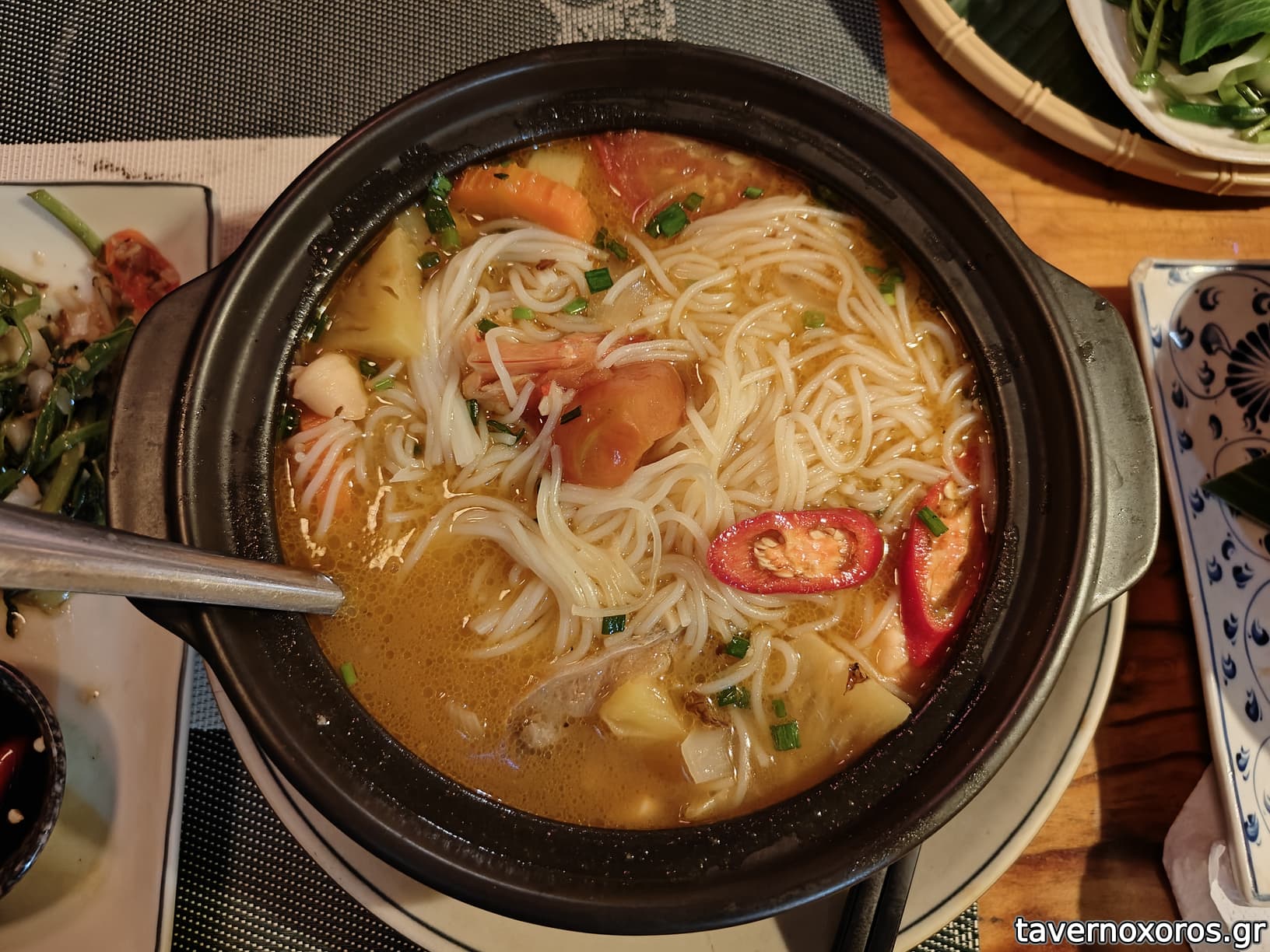 Ήρθε ένα αχνιστό πήλινο με σούπα το οποίο περιείχε γαρίδες, ροδέλες καλαμάρι και κομμάτια από δικό τους ψάρι το οποίο θα το παρομοιάζαμε με γαλέο, μαζί με καρότα, λαχανικά και αμέτρητα κομμάτια ανανά. Μαζί ήρθε και ένα δεύτερο πιάτο με 2 τούφες noodles, καυτερή σάλτσα και έξτρα λαχανικά, τα οποία τα έριχνες μέσα στο πήλινο που ακόμα έβραζε.