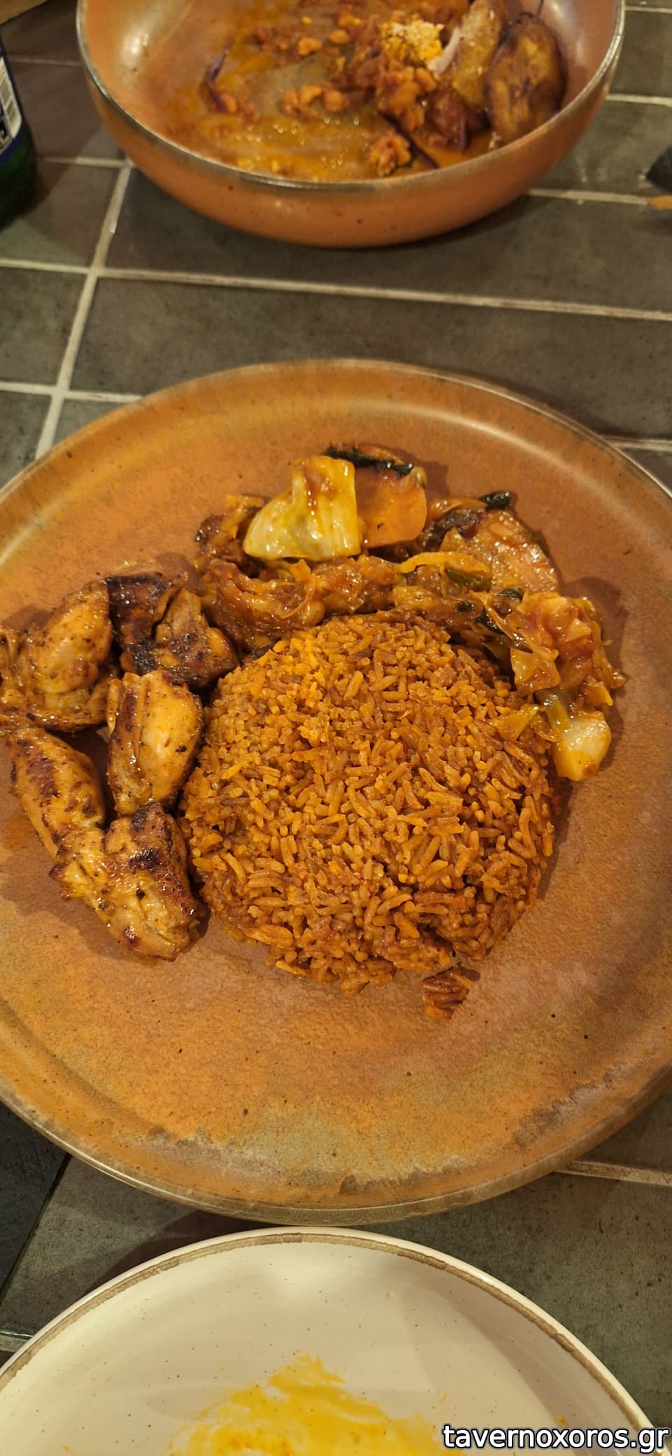 Jollof rice με κοτόπουλο (πολύ καλό το κρέας, το ρύζι λίγο στεγνό και χωρίς μεγάλη ένταση)