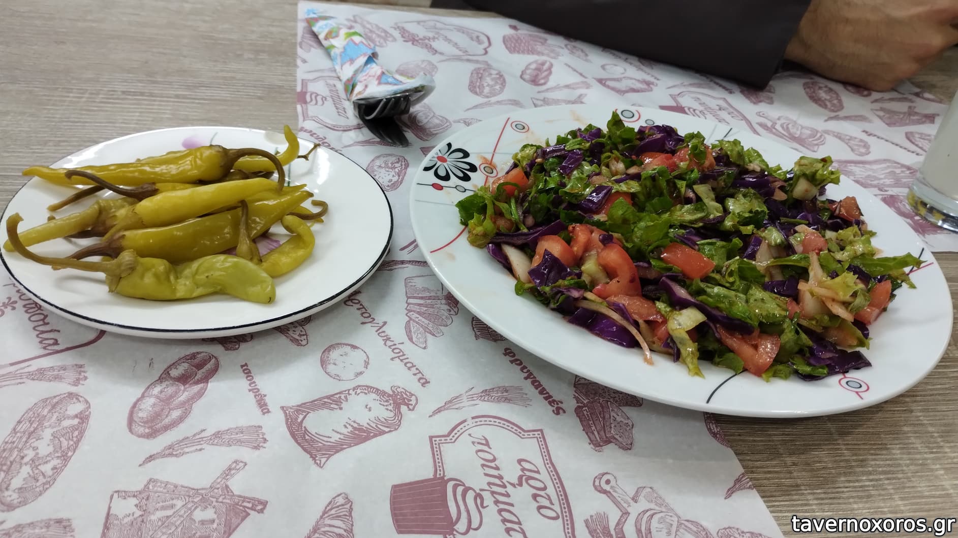 Αριστερά πιπεριές (καυτερές, όχι γλυκιές) και δεξιά σαλάτα, πίτα στο μπαλσάμικο