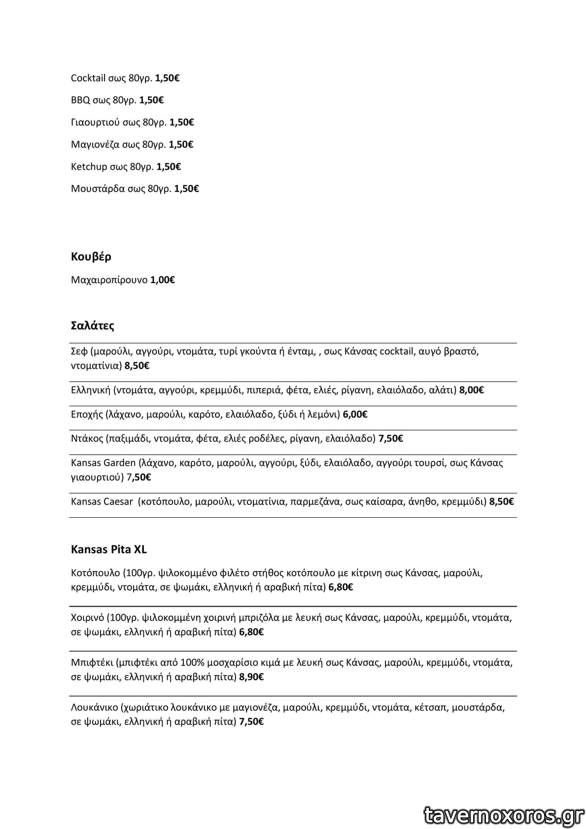 | Λέξεις κλειδιά | Κάνσας, #burgers, #ντάκος, #χοιρινή, #κοτόπουλο, #λουκάνικο, #μπιφτέκι, #πανσέτα, #σουτζουκάκια, #ομελέτα, #falafel, #σουβλάκια, #πίτσα, #club sandwich, #steaks, #σάντουιτς |
