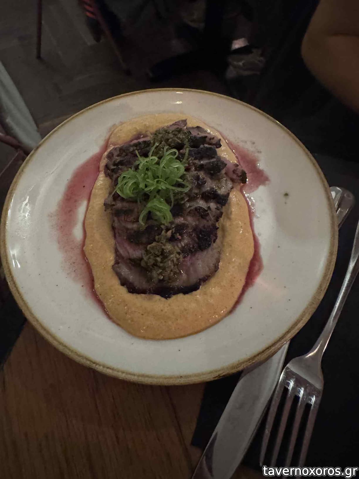 Μοσχάρι black angus με labneh και πάπρικα, φρέσκο κρεμμυδάκι και chimichurri (πολύ καλό, η τύπου σάλτσα από το γιαούρτι με την πάπρικα έδενε υπέροχα)