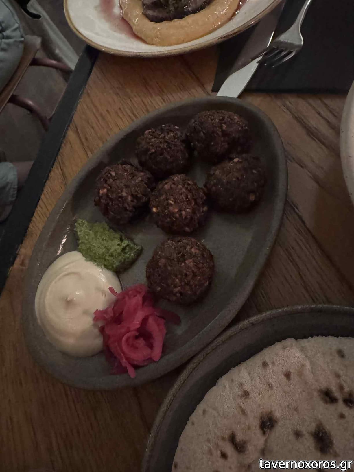 Φαλάφελ με σάλτσα ταχίνι-λεμόνι, πάστα βοτάνων και πίκλες κρεμμύδι (πολύ καλό)