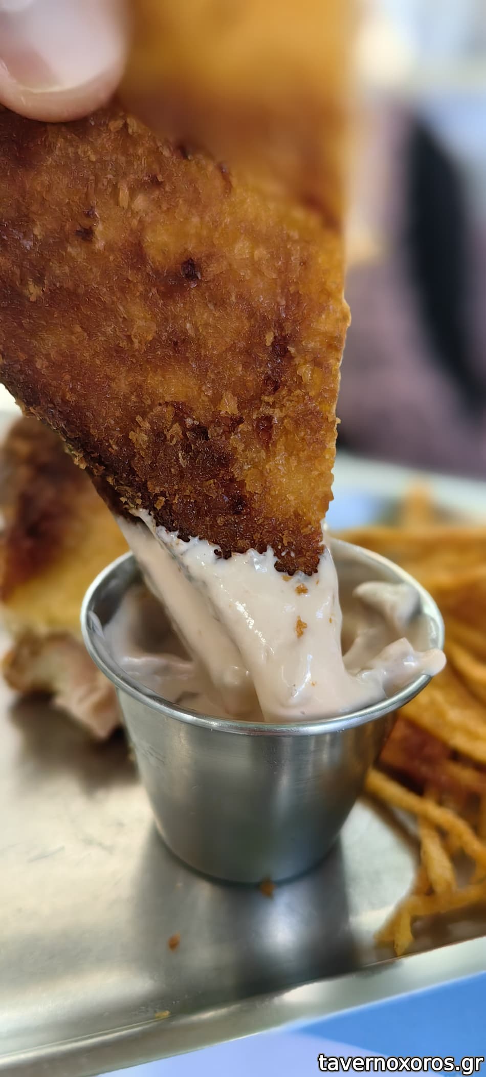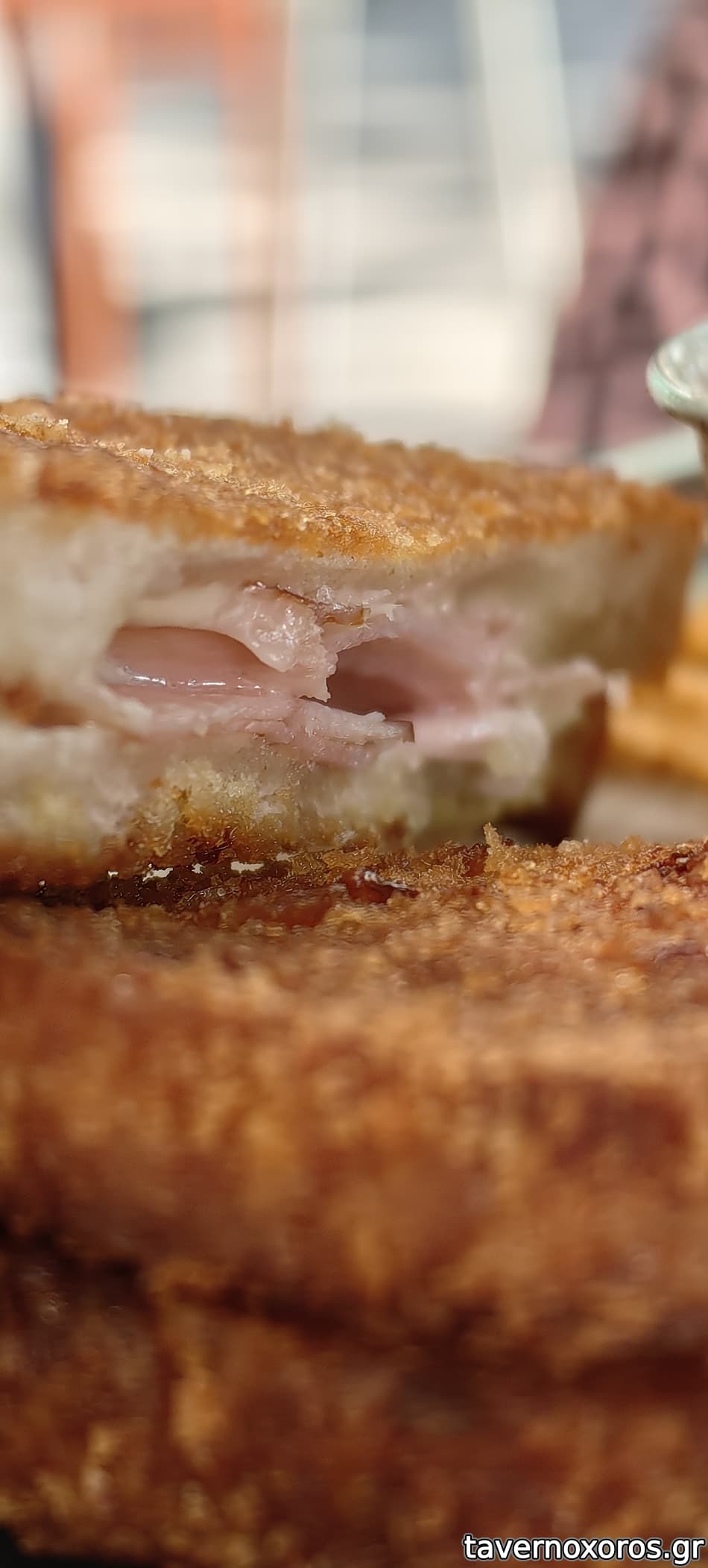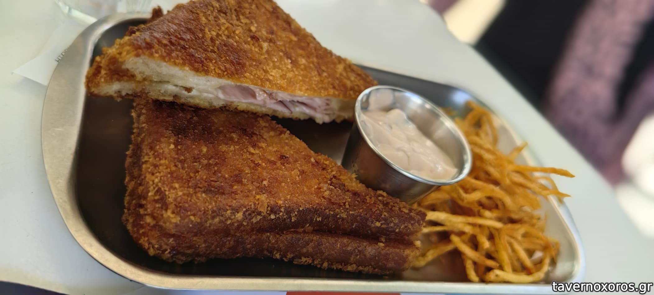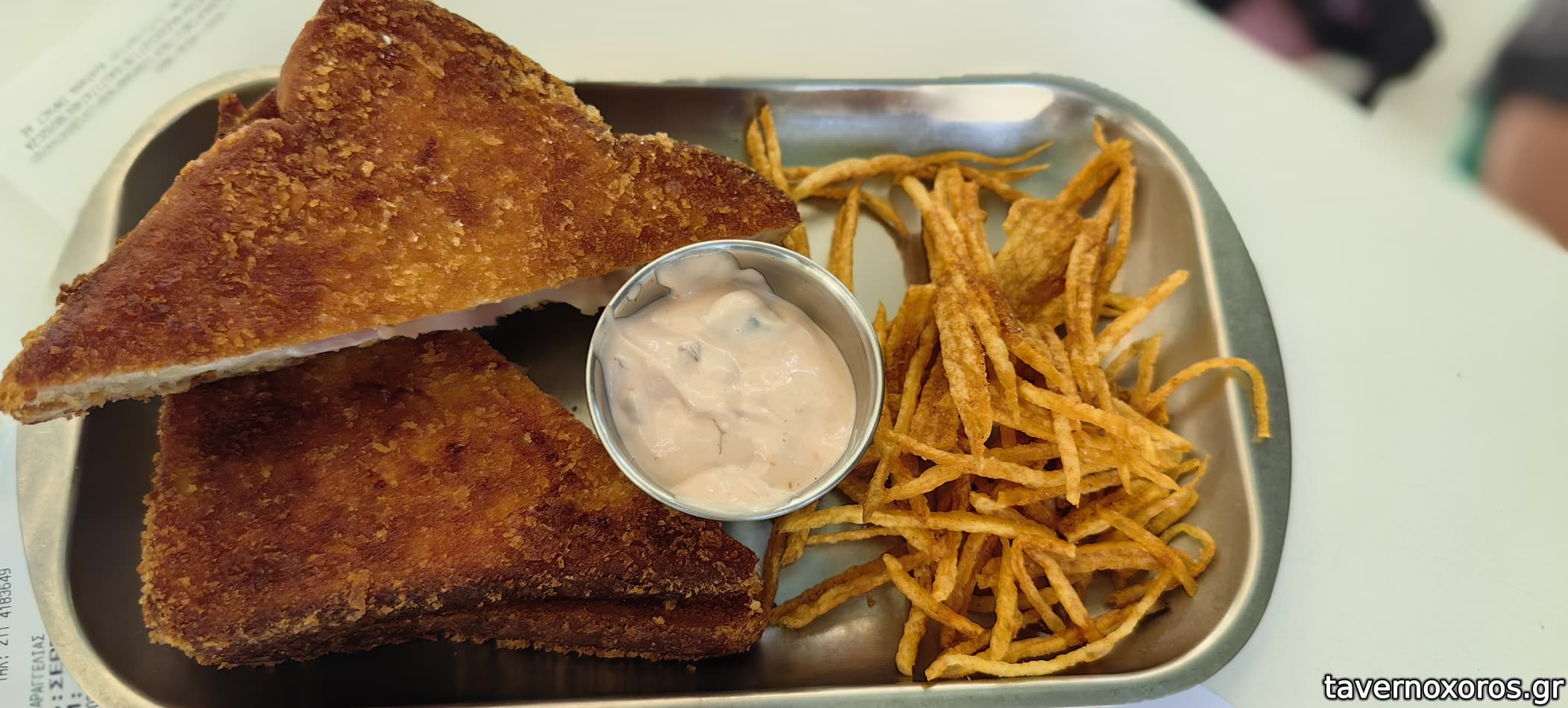Τοστ/σαντουιτς παναρισμενο και τηγανισμενο (!) με φοβερη κρουστα. Συνοδευοταν απο λεπτα στικς πατατας και μια πολυ ταιριαστη ταρταρ σως.
