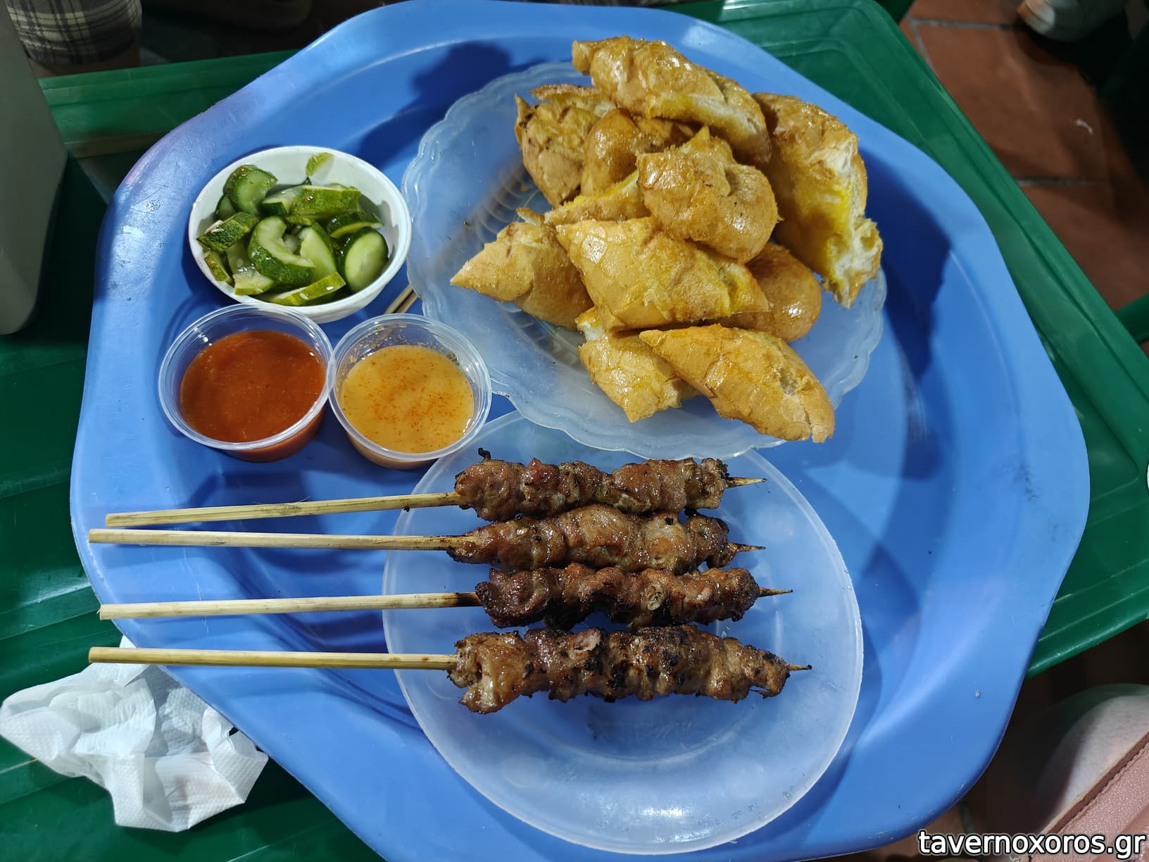 Κάτσαμε και κατευθείαν μας πρότειναν χοιρινά σουβλάκια, καθώς μας είδαν τουρίστες, Παραγγείλαμε 8 για την δοκιμή (25 λεπτά το ένα), γνώριμα σε γεύση και νόστιμα.
