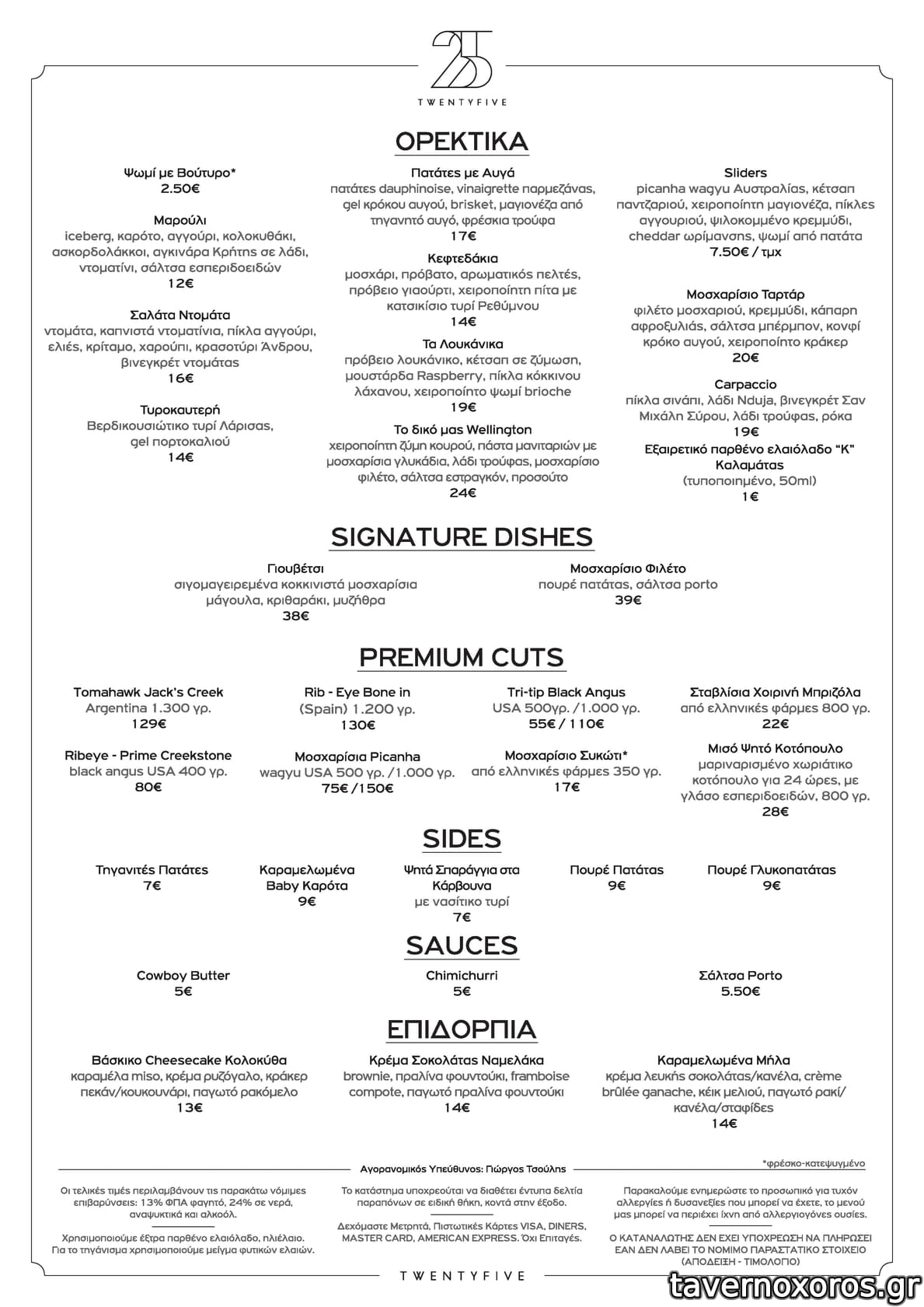| Λέξεις κλειδιά | 25, TwentyFive, #κάρβουνα, #ομελέτα με πατάτες, #κεφτεδάκια, #λουκάνικο, #μοσχαρίσια μπριζόλα, #κοπές, #steaks, #wagyu, #γιουβέτσι, #συκώτι, #κοτόπουλο, #πανσετομπριζόλα |