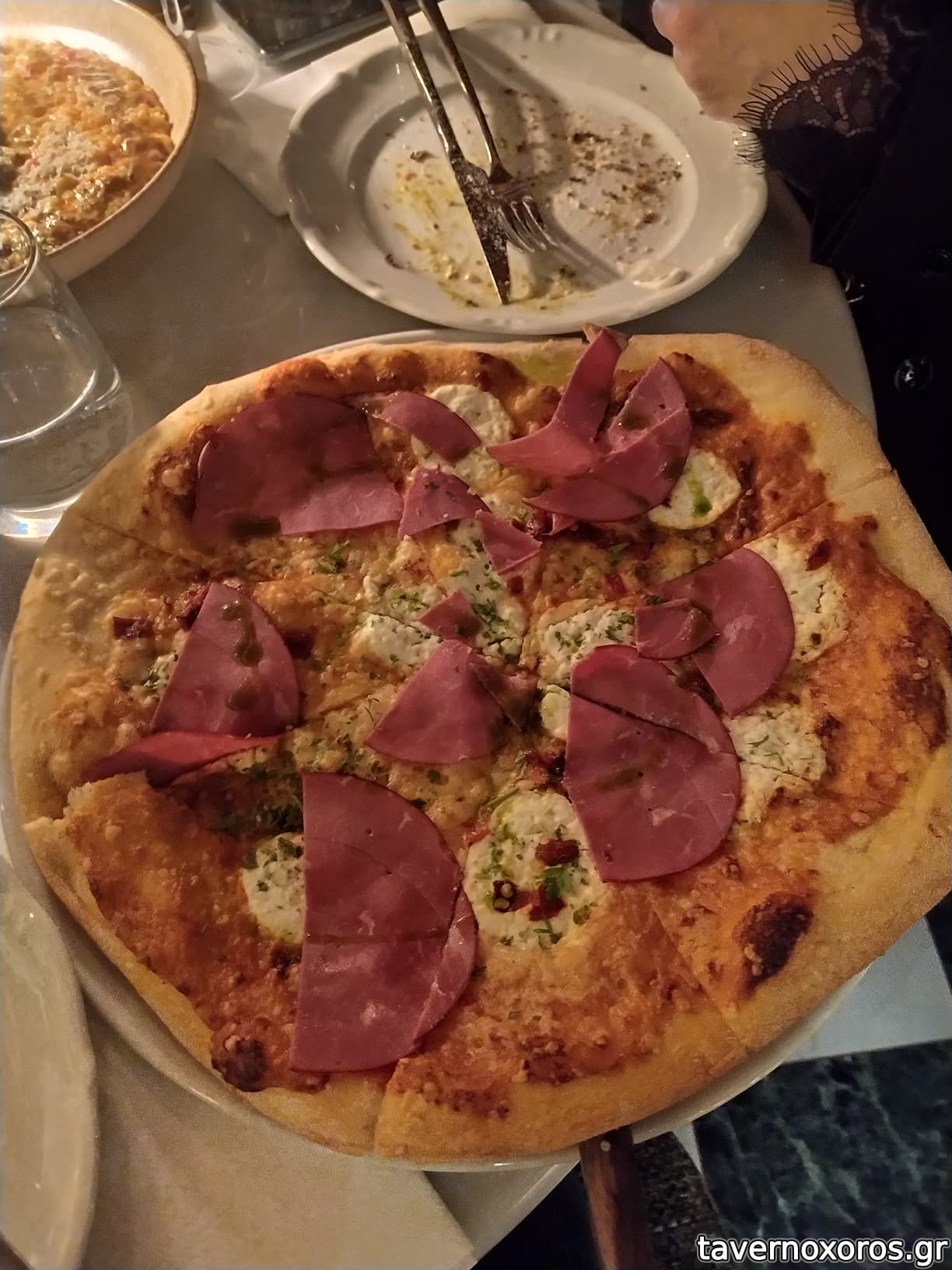 Pizza romasco: μυρώνια, πιπεριές, τυρί τσαντίλα, λούζα (πολύ κακή, αταίριαστα υλικά και κακό ζυμάρι, το τυρί ενοχλητικά ξινό)