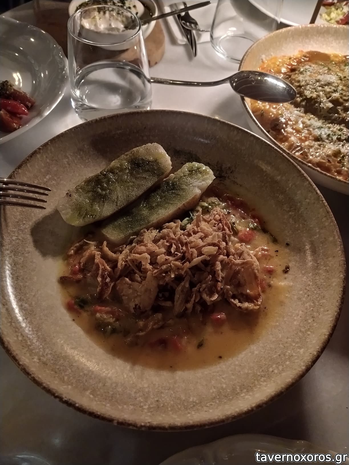 Μπακαλιάρος: beurre blanc, κρεμμύδι, καμμένο μαρούλι, πιπεριά Φλωρίνης (πολύ καλό)