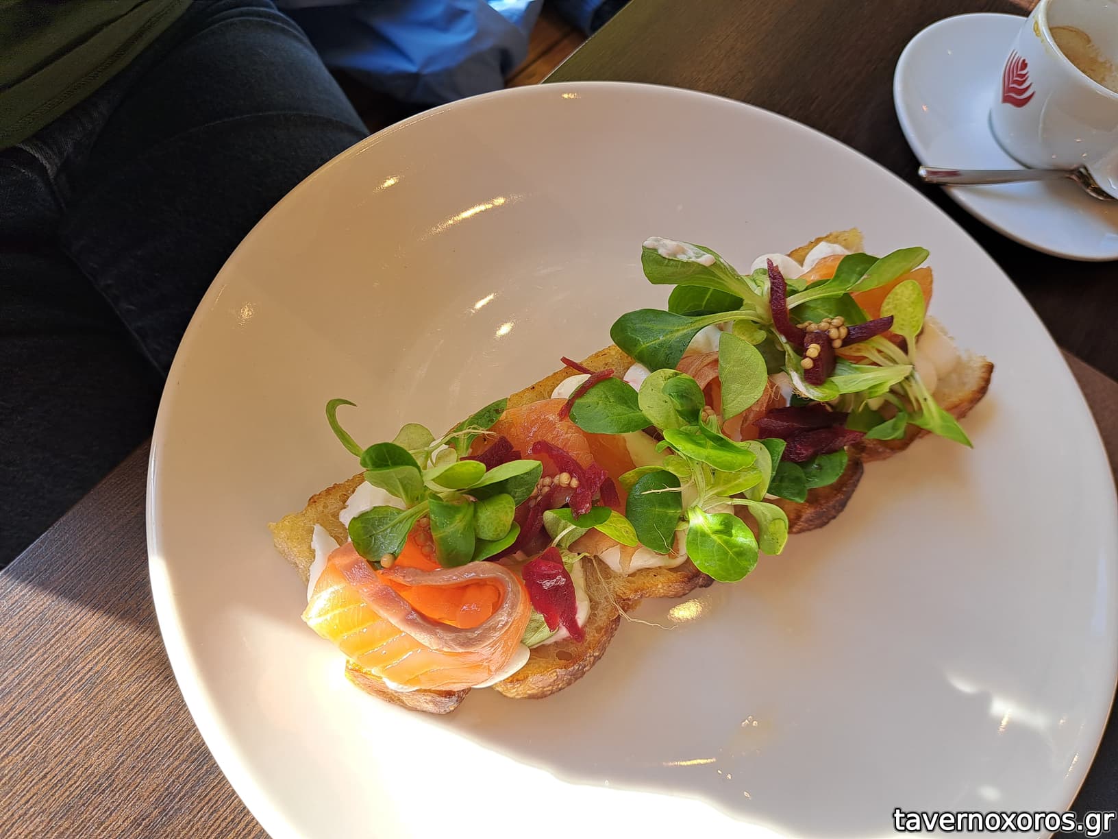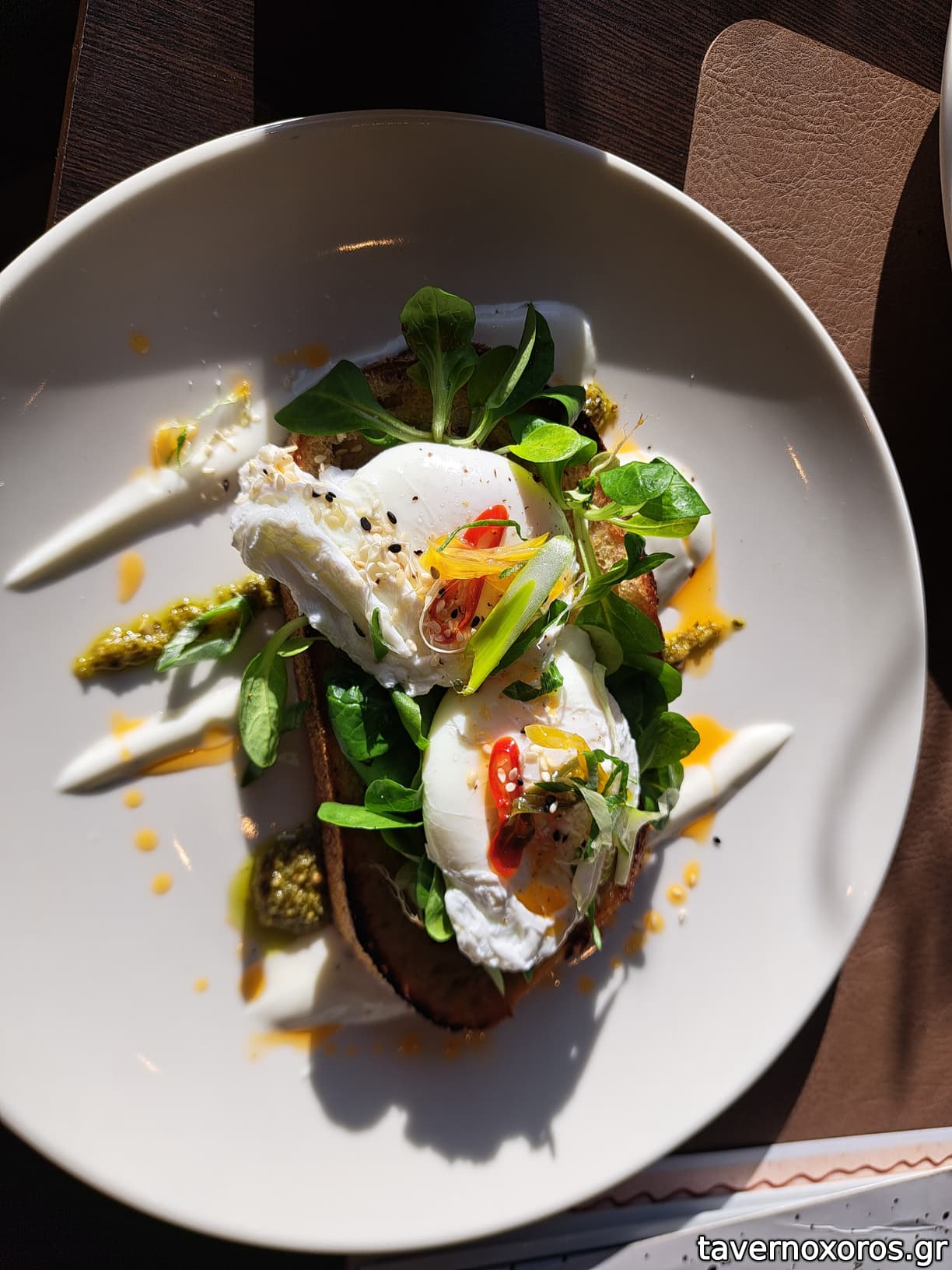 Ένας καπουτσίνο και δύο αυγά ποσέ με τσίλι και sourdough ήταν ο,