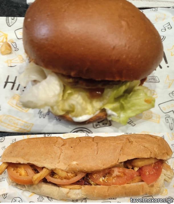 Επάνω χάμπουργκερ, κάτω χοτ ντογκ ψητό.