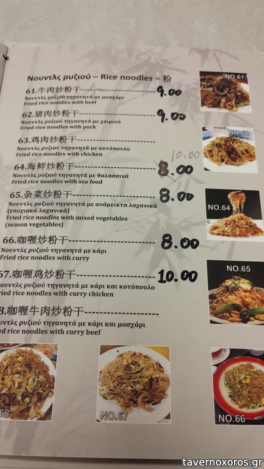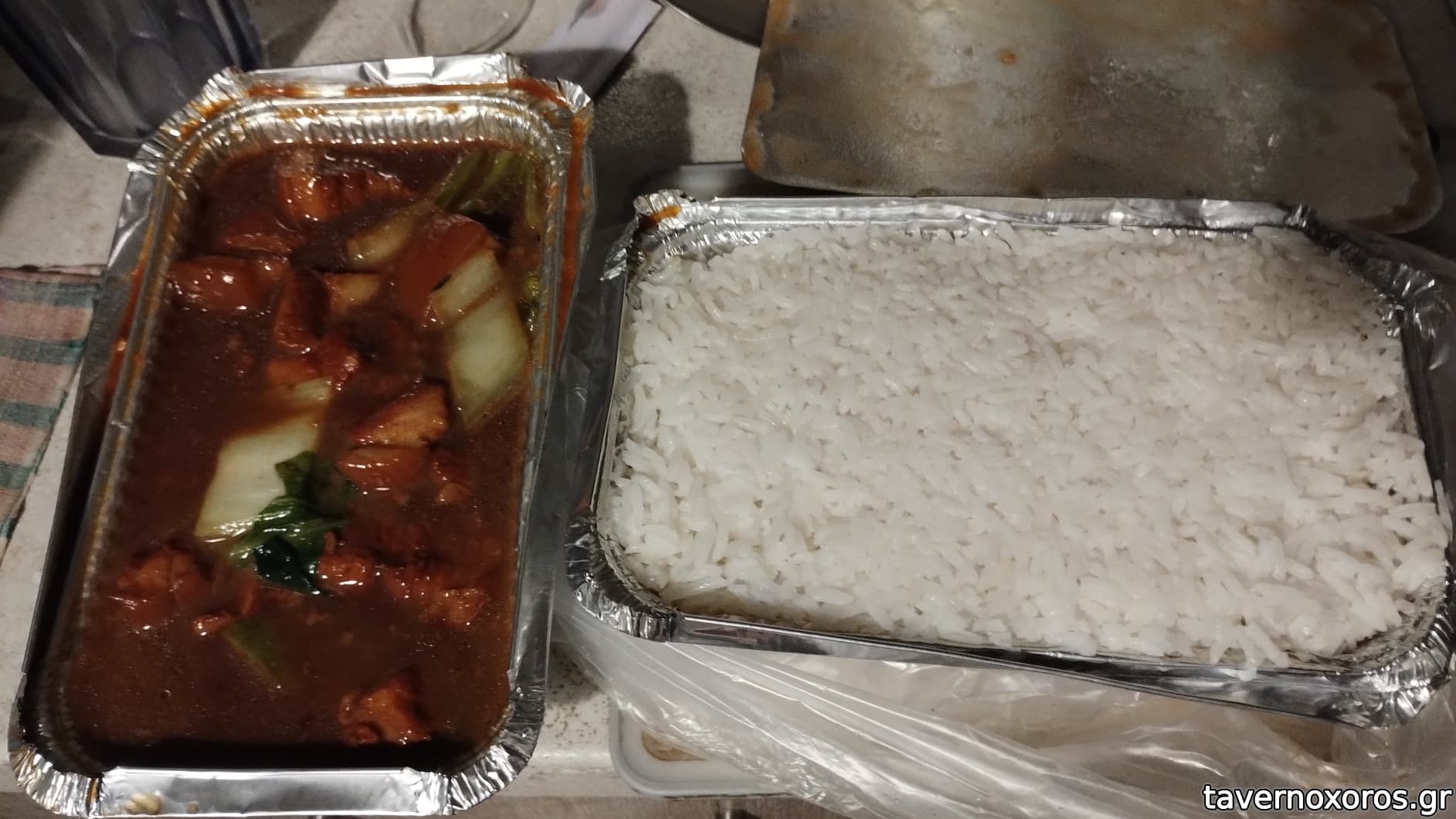 Πακέτο take away από τον μπουφέ (οκ). Δεξιά ρύζι ατμού (8ε)