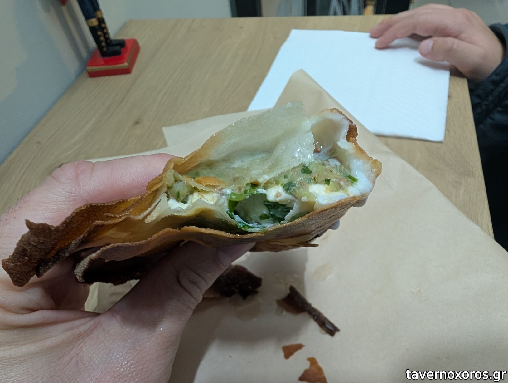 Η πίτα λαστιχωτή (ο φίλος το βρήκε διάνα και το είπε στον ιδιοκτήτη: βάζει γιαούρτι στη ζύμη!), το κρέας φουρνιστό, αλλά το σύνολο καλό. Επίσης μάς κέρασε από 1 μπρικ (παραφθορά τού burek), πίτα με σφολιάτα και μέσα ένα αβγό. Μάς άρεσε πολύ, αλλά για μένα είναι πιο πολύ πρωινό έδεσμα.