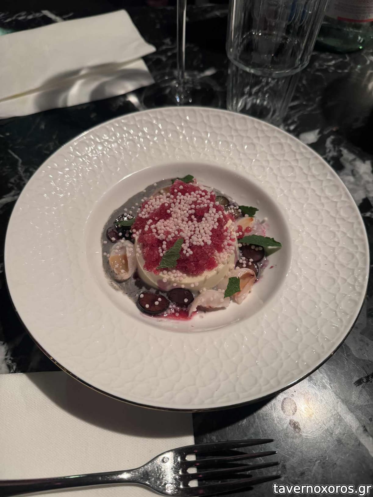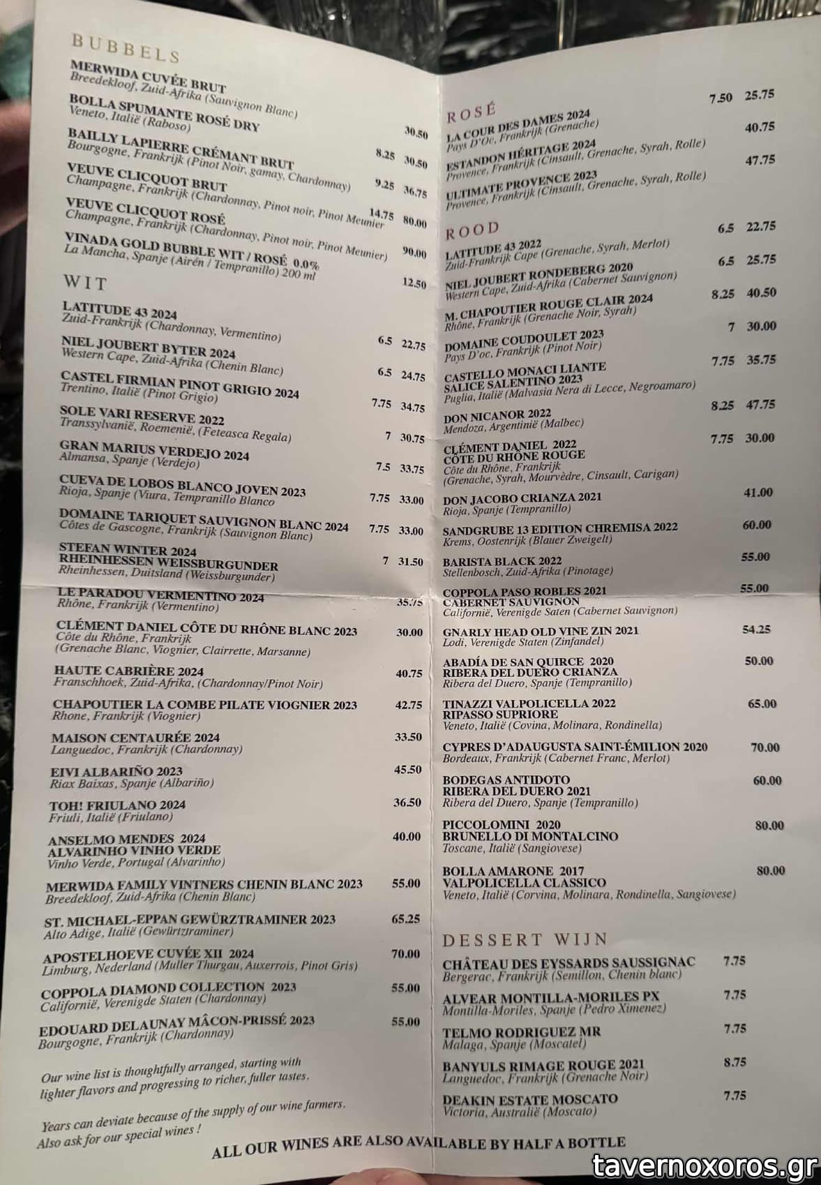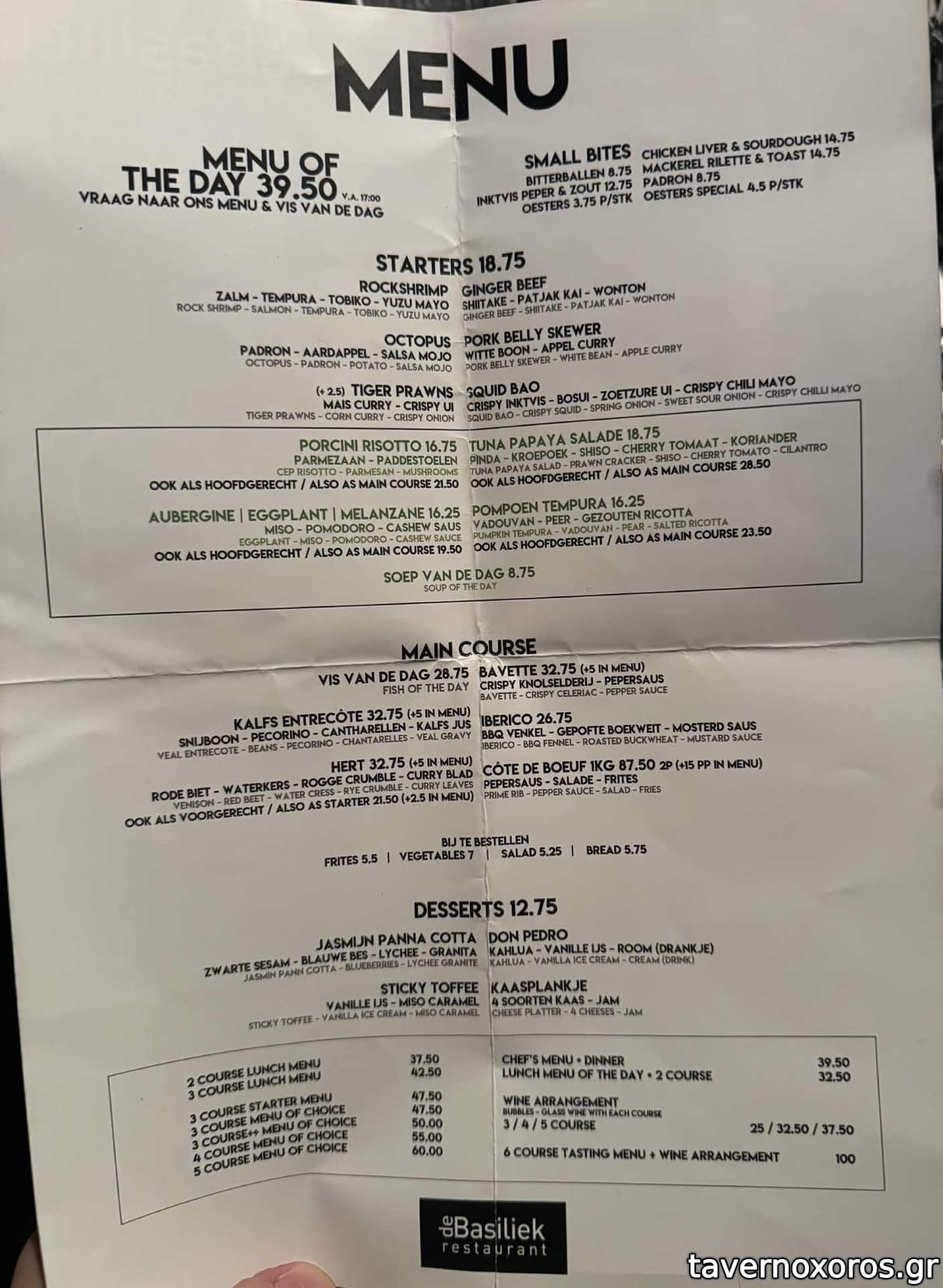 Το φαγητό, τύπου bistro με διεθνείς επιρροές, δεν με ξετρέλανε χωρίς να είναι κακό. Οι πρώτες ύλες μου φάνηκαν αισθητά πάνω από τον μέσο όρο. Ομολογουμένως vfm για δεδομένα Ολλανδίας. Επίσης, είχε αρκετές οικονομικές επιλογές στα κρασιά. Στον κατάλογο κάτω-κάτω γράφει "all our wines are also available by half a bottle", το οποίο δουλεύει ως εξής: διαλέγεις το μπουκάλι, το ανοίγουν στο τραπέζι, σερβίρουν και το αφήνουν εκεί, ώστε να κρίνεις εσύ (!) ποια είναι η μέση του μπουκαλιού. Αχρείαστο άγχος θα πω εγώ. Άλλη μια σημείωση: στο τραπέζι υπάρχουν εμφιαλωμένα μπουκάλια με νερό από πριν, τα οποία αν δεν τα ανοίξεις δεν τα χρεώνουν.