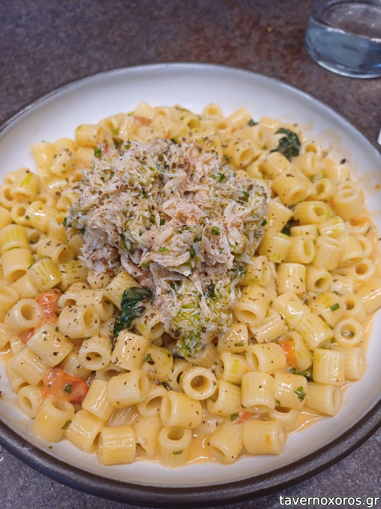 Μπλε καβούρι, κοφτό μακαρονάκι, κρέμα γαρίδας, λάδι σουτζούκι (ωραίο και ελαφρύ σχετικά)