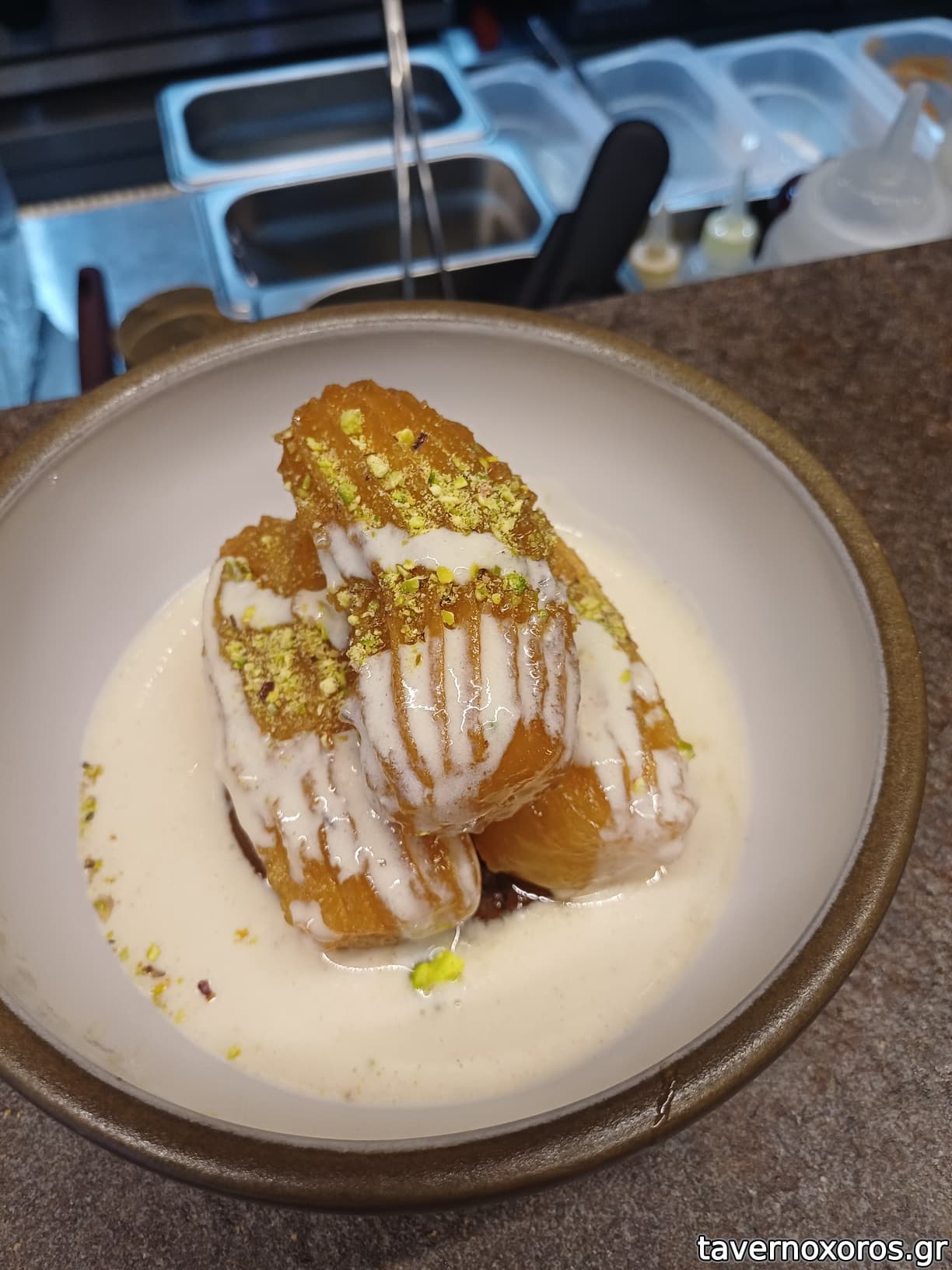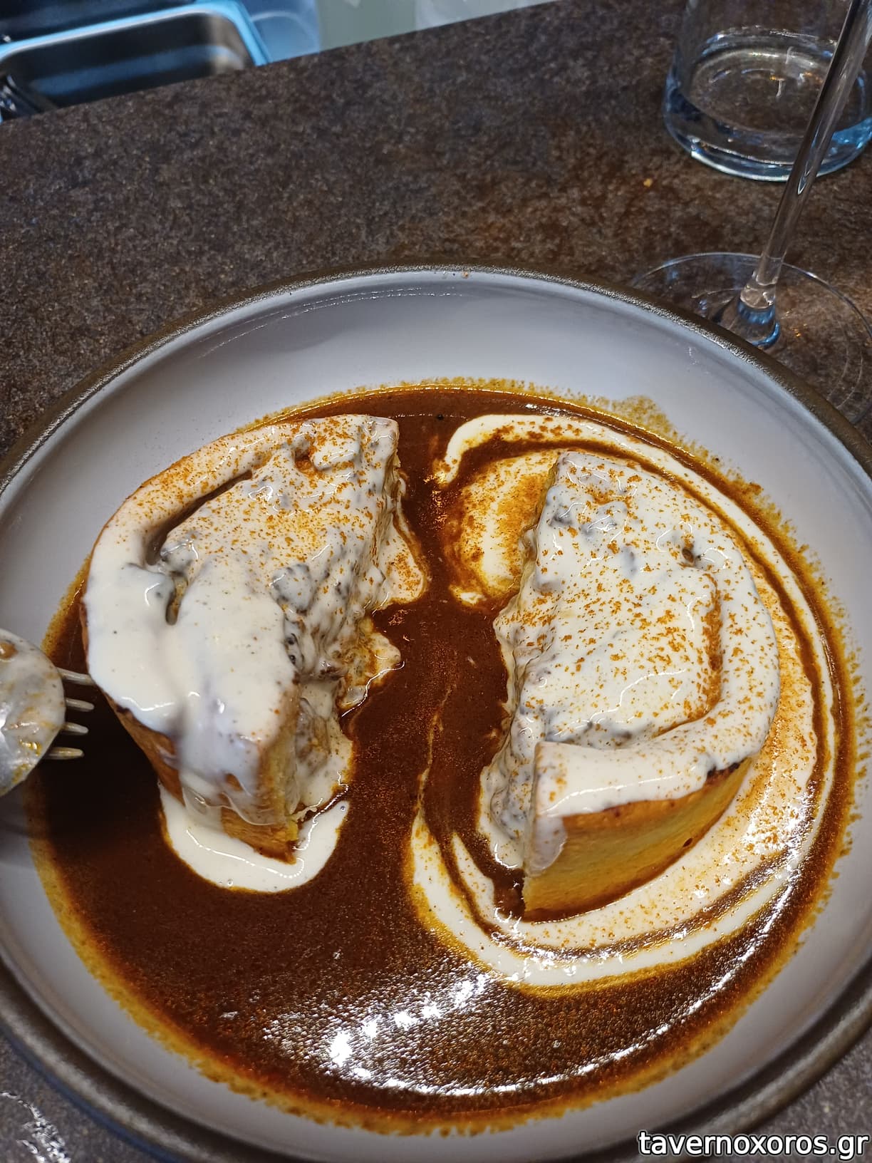 Cinnamon roll κόκκορας, σάλτσα παστιτσάδας, κρέμα μετσοβόνε (πολύ καλό, το πιο ιδιαίτερο πιάτο του γεύματος)