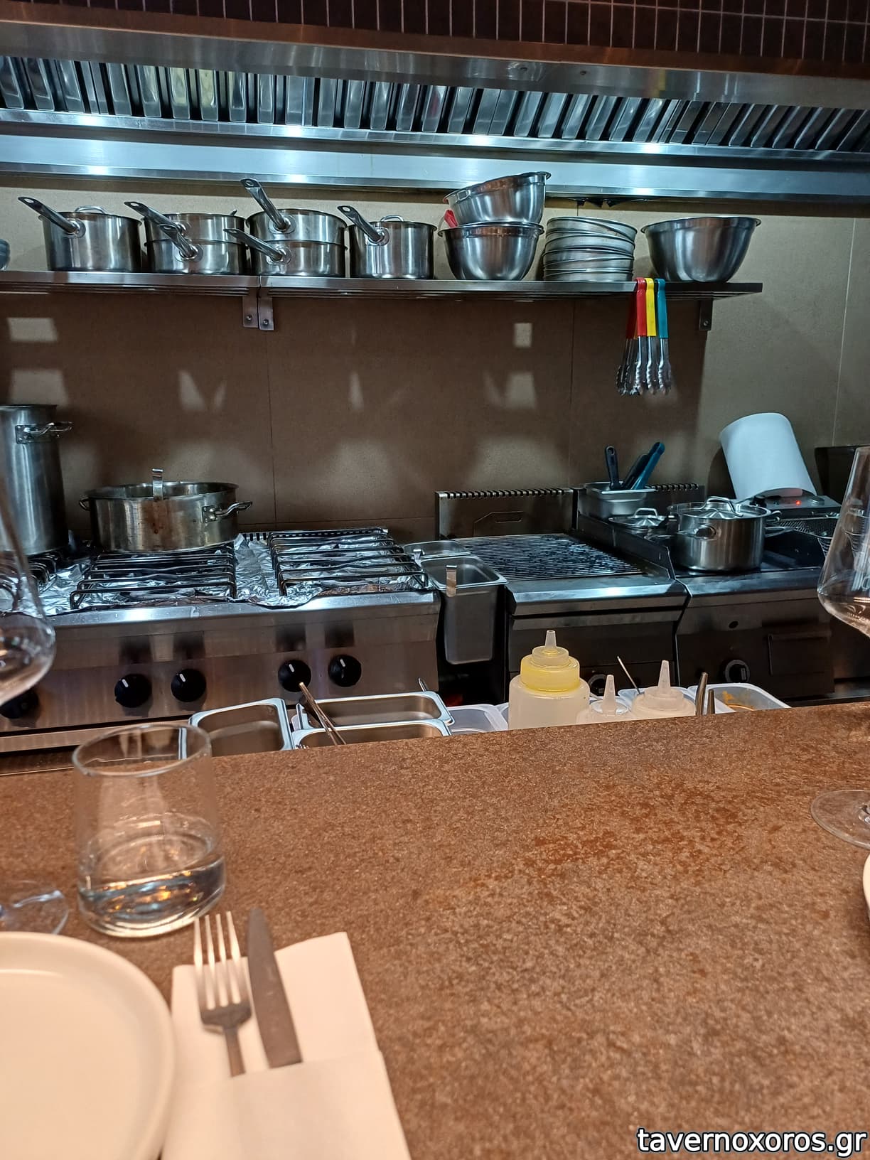 Η κουζίνα ακριβώς μπροστά στο μπαρ, στην οποία γίνεται το φινίρισμα των πιάτων