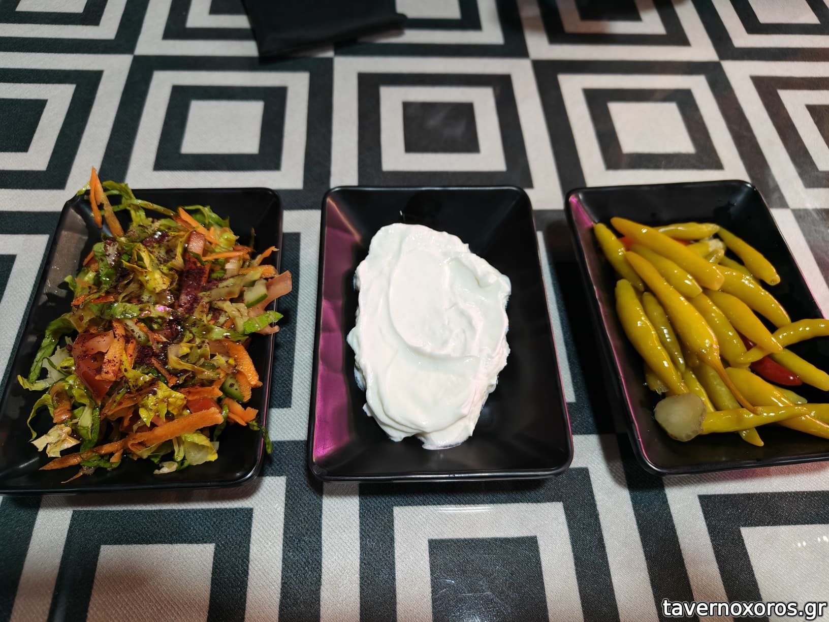 Στην αρχή φέρνουν τα συνοδευτικά, μια σαλατούλα, γιαούρτι και υπέροχες καυτερές πιπερίτσες τουρσί. Όλα ήταν νόστιμα.