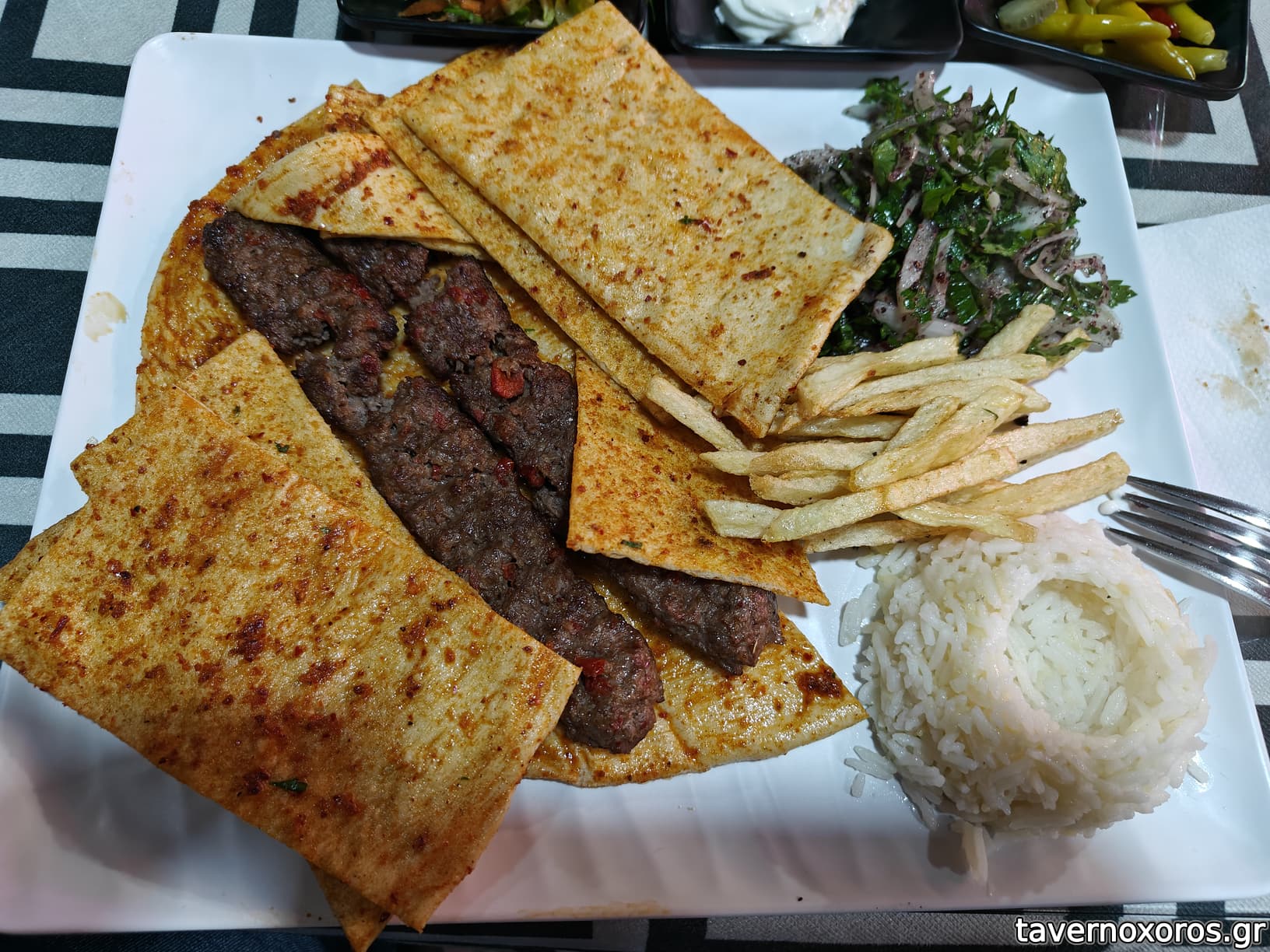 Η μερίδα περιλαμβάνει 2 κεμπάπ, άπειρες πιτούλες λουσμένες σε σάλτσα και σουμάκ, άλλη μια σαλατούλα με κρεμμυδάκι, σουμάκ και μαϊντανό, λίγες φρέσκιες τηγ. πατάτες και 1 μπωλ αρωματικό ρύζι.