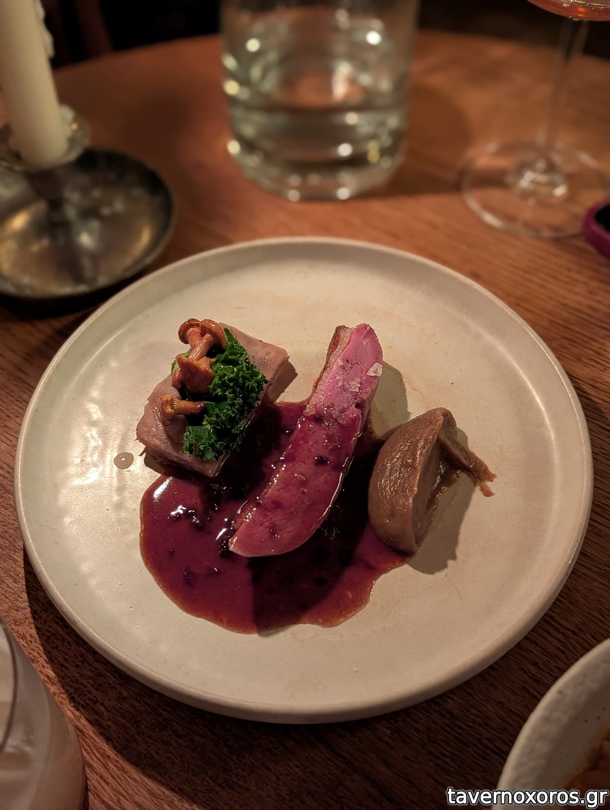 Duck: duck jus, blackberries, caramelised Jerusalem artichoke purée, pickled chanterelle, kale, celeriac millefeuille (εξαιρετικό)