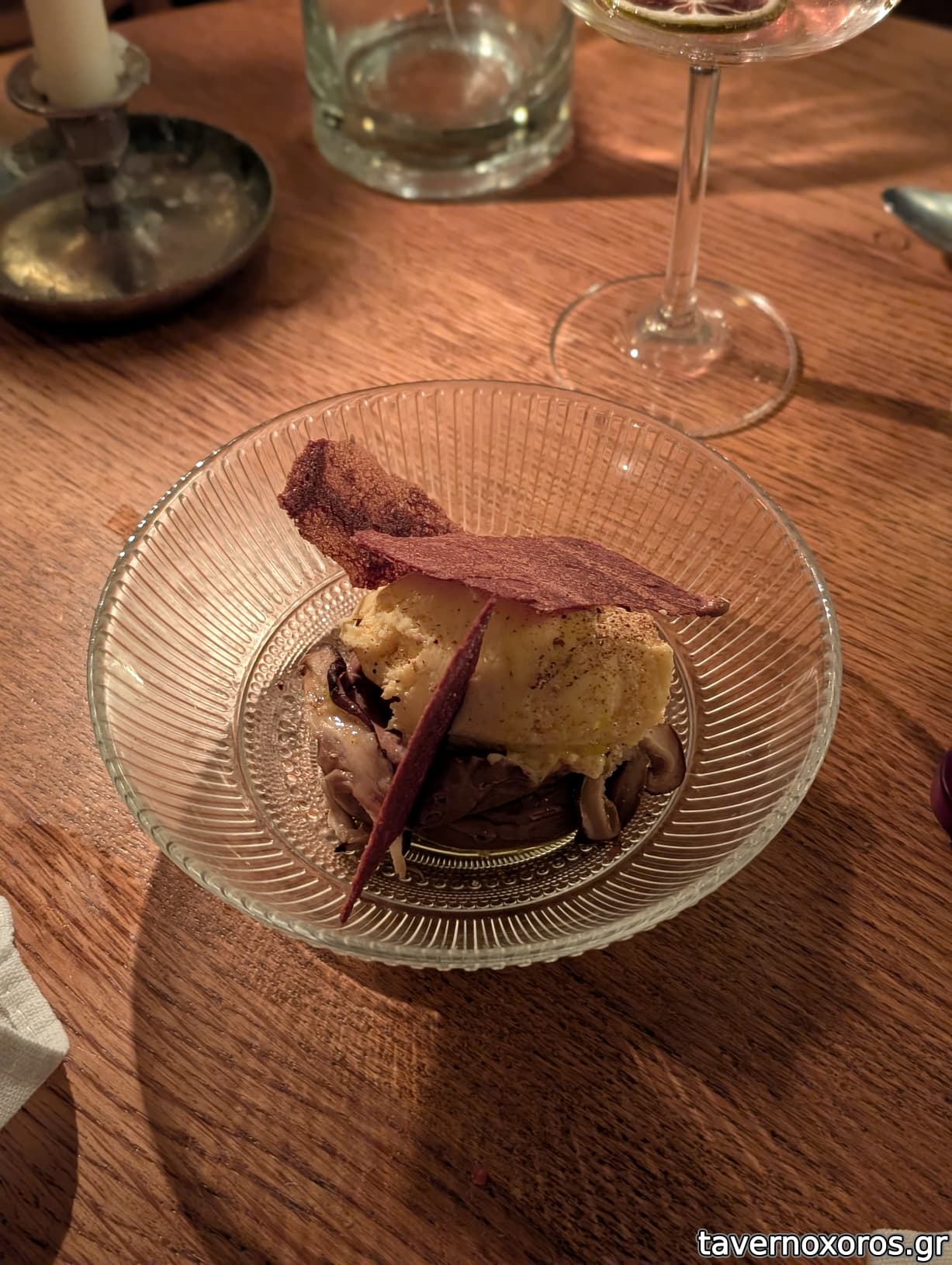 Chocolate: gianduja cream, shiitake, sourdough ice cream, cacao (αριστούργημα)