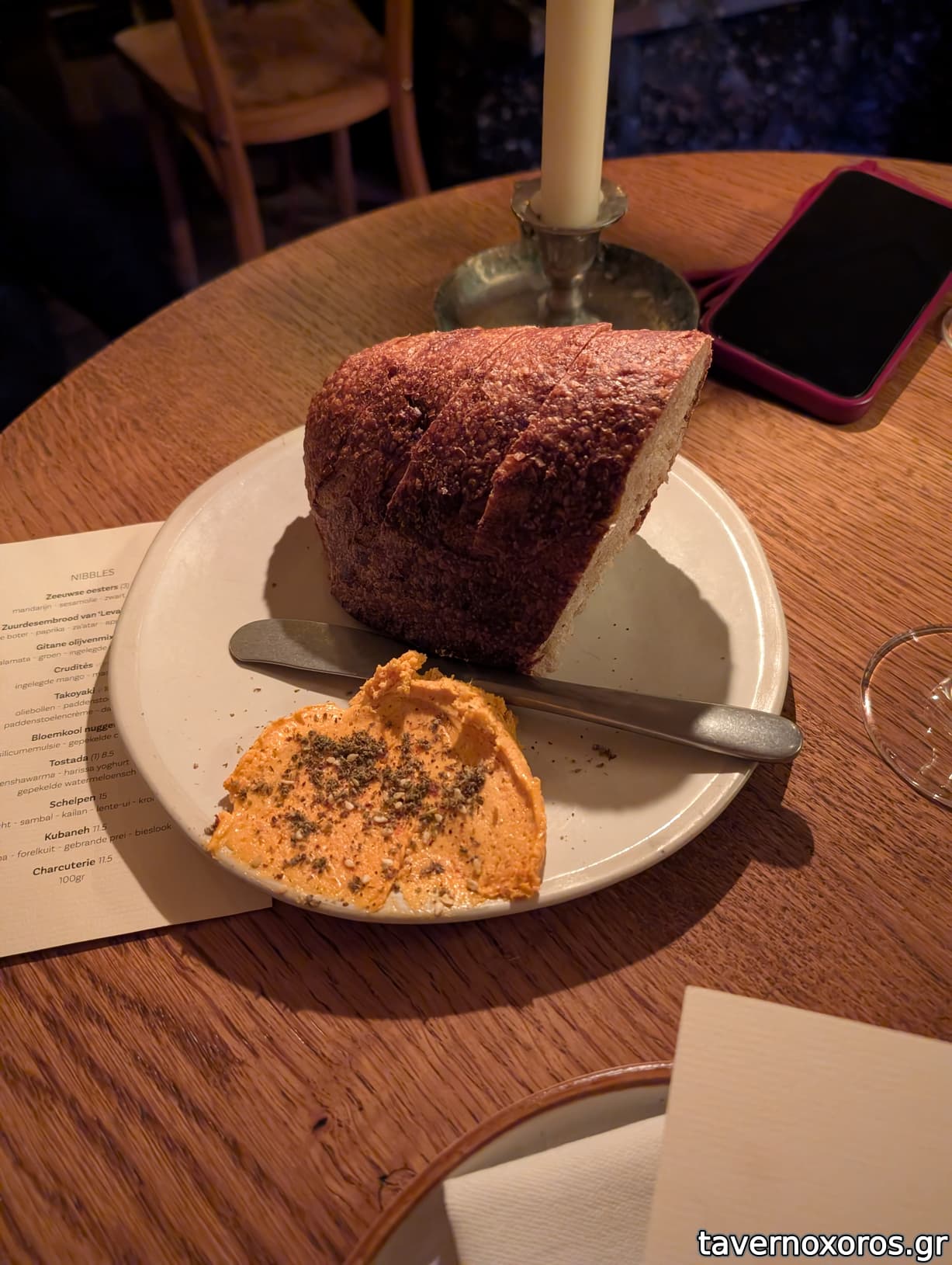 Sourdough bread: whipped butter, paprika, za'atar, apple molasses, hazelnuts (αδιανόητα καλό το ψωμί, βαθιά γεύση, αφρός μέσα, τραγανό απέξω)