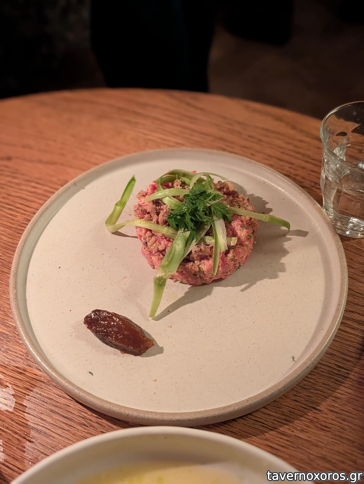Steak tartare: 'nduja, green asparagus, brioche crumble, spiced aubergine compote (καλό, η κομπόστα εξαιρετική)