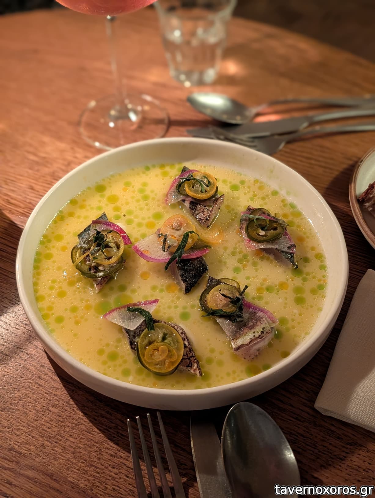 Crudo: mackerel, radish, kalamansi and shiso broth, eel emulsion, kumquat, chili oil (πολύ καλό, ισορροπημένο, το ζουμί υπέροχο)