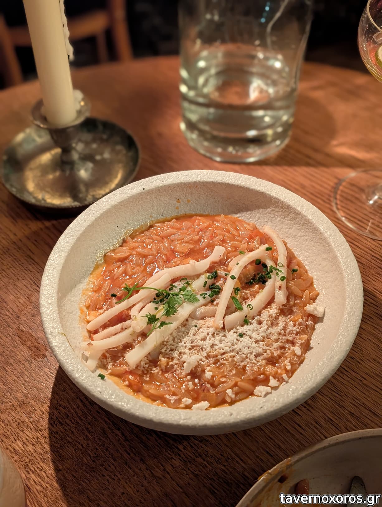 Orzo "kakavia": squid tagliatelle, bergamot vinegar, tsantilaki (καταπληκτικό, ωραίες εντάσεις)