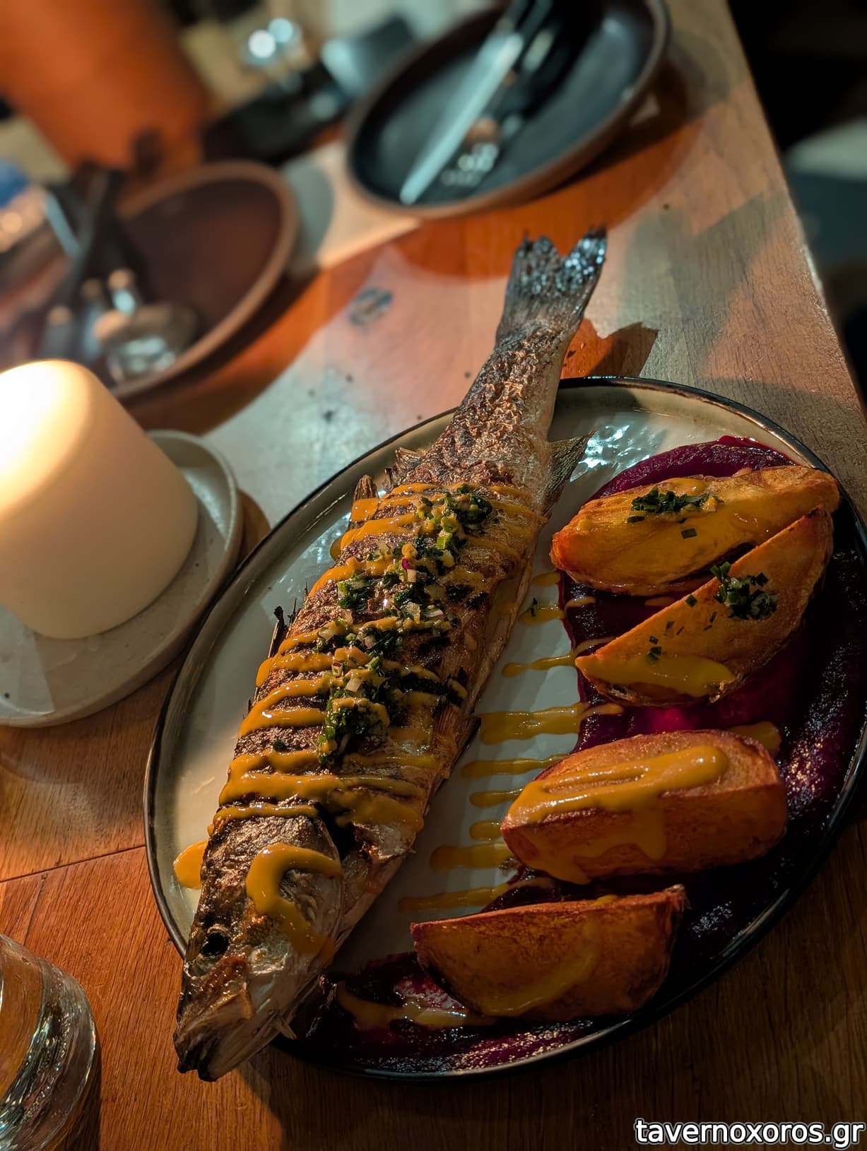 Πιάτο 4: Λαβράκι στη σχάρα με πατάτες και μια κρέμα παντζάρι (μέτριο, το ψάρι στεγνό, η κρέμα παντζάρι νόστιμη)