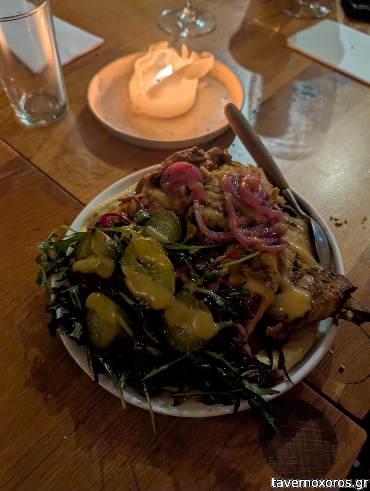 Πιάτο 3: Κοτόπουλο στη σχάρα με σαλάτα, λαχανικά τουρσί και σάλτσα labneh (καλό, εμφανισιακά υστερεί)