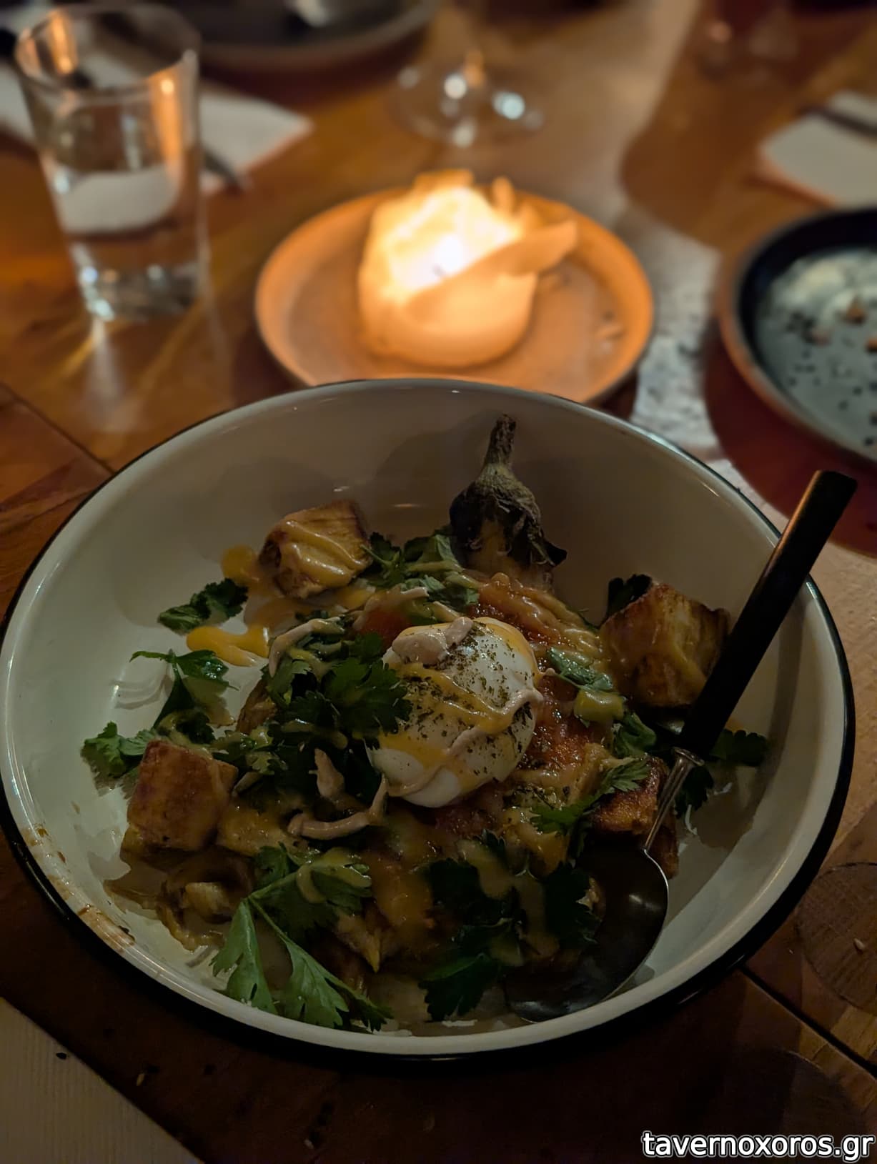 Πιάτο 2: Τύπου μελιντζανοσαλάτα με αυγό ποσέ και τοπιναμπούρ (αδιάφορο, το αυγό αταίριαστο)