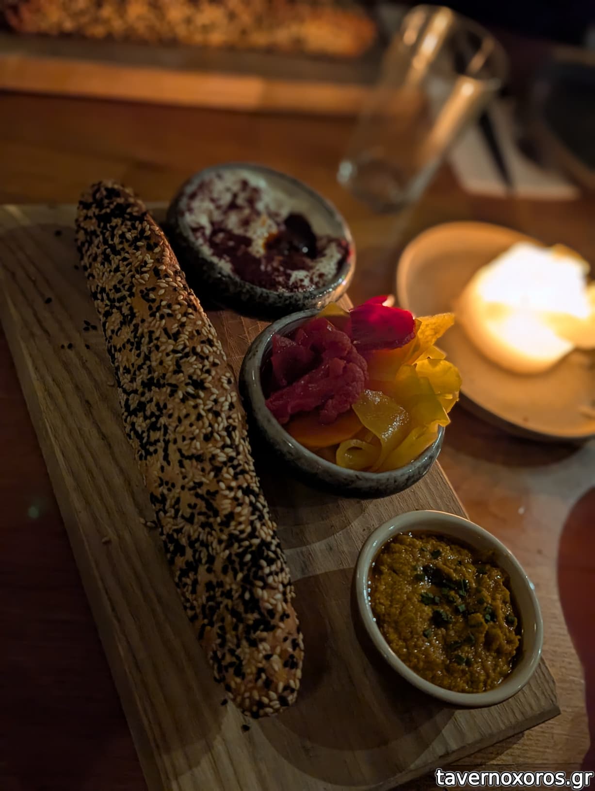 Πιάτο 1: Ψωμί με labneh, λαχανικά τουρσί και ένα ντιπ ελιάς (από πάνω προς τα κάτω, όλα μια χαρά)