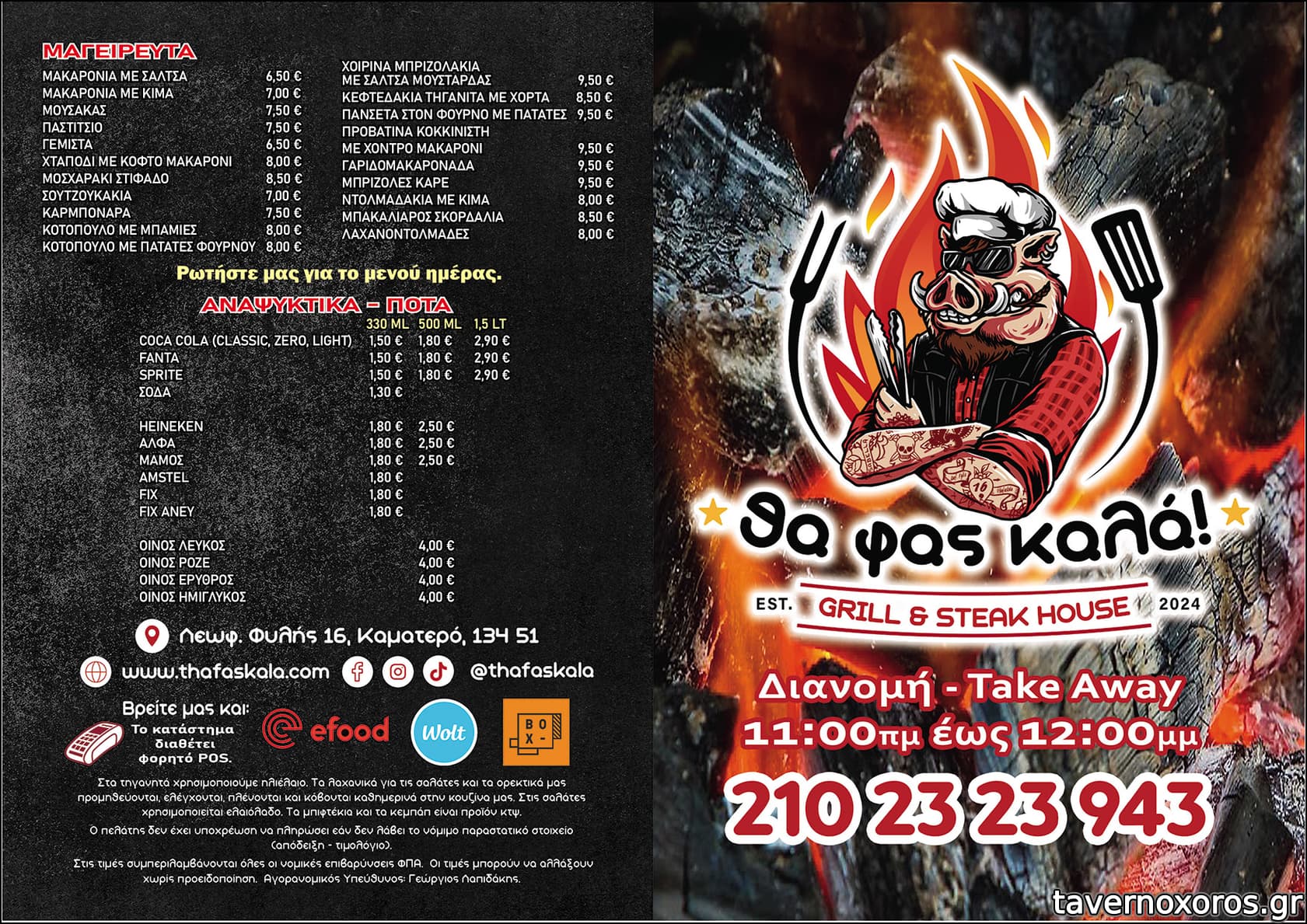 | Λέξεις κλειδιά | Tha fas kala, θαφασκαλα, #pos delivery, #σούβλες, #κεμπάπ, #κοκορέτσι, #πανσέτα, #εξοχικό χοιρινό, #κοτόπουλα σούβλας, #πρόβειο, #πορτσέτα, #φρυγαδέλι, #σπληνάντερο, #κεφαλάκια, #κοτόπουλο, #αρνάκι, #κλέφτικο, #γουρουνόπουλο, #προβατίνα, #ντάκος, #πιπεριές, #σουβλάκια, #σουτζουκάκια, #μπιφτέκι, #λουκάνικο, #σάντουιτς, #παϊδάκια, #χοιρινή, #μοσχαρίσια μπριζόλα, #πανσετομπριζόλα, #μπιφτέκι προβατίνας, #μοσχαρίσια σπαλομπριζόλα, #πρόβειο παϊδάκι, #μουσακάς, #παστίτσιο, #κοκκινιστό, #λεμονάτο, #σουτζουκάκια σμυρνέικα, #λαχανοντολμάδες, #μπεκρή μεζές, #λαδερά, #γεμιστά, #μπακαλιάρος σκορδαλιά, #γαριδομακαρονάδα, #σουπιά κρασάτη, #χταπόδι, #μπακαλιάρος, #κανελόνια, #μακαρονάδες, #σοφρίτο, #παπουτσάκια, #μπριάμ, #φασολάδα, #μοσχαράκι λεμονάτο, #γιουβαρλάκια, #βραστό, #φασόλια γίγαντες, #γιουβέτσι, #κόκορας κρασάτος, #μοσχάρι στιφάδο, #κεφτεδάκια, #προβατίνα κοκκινιστή |