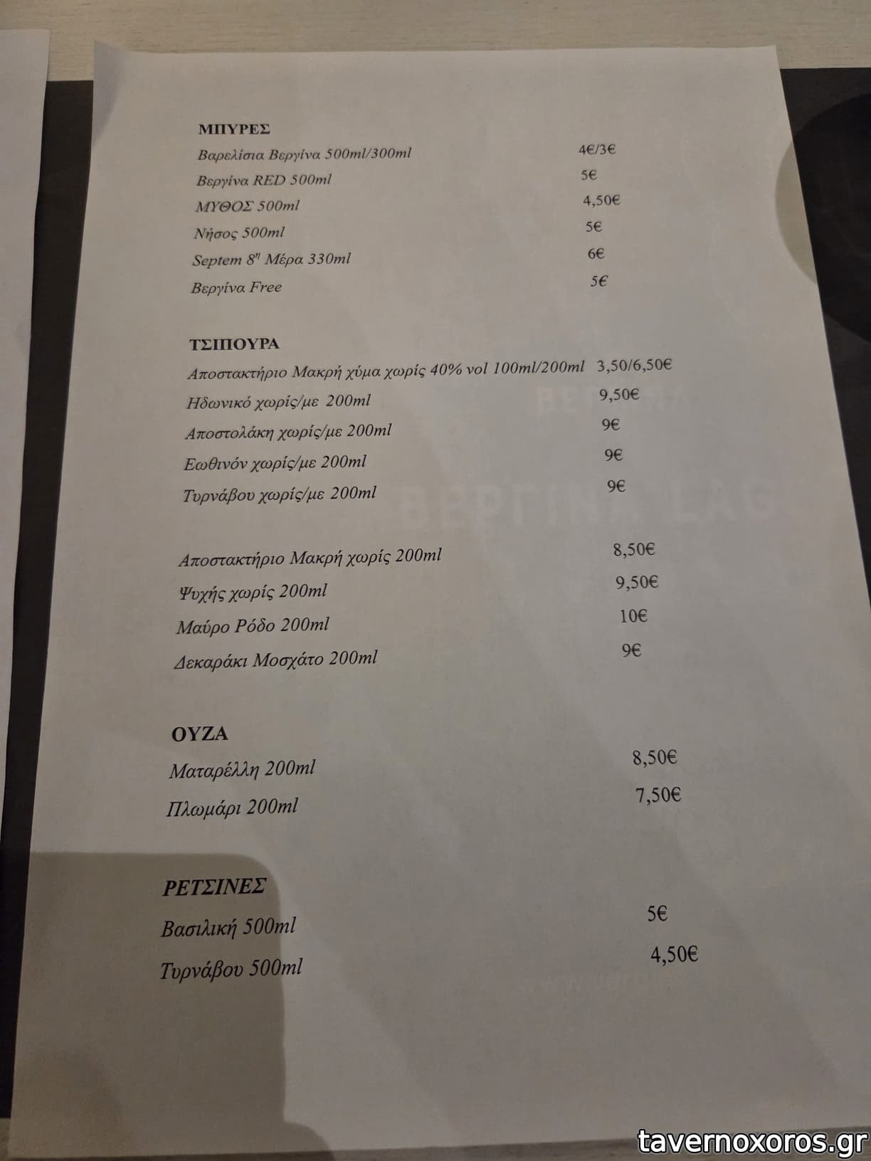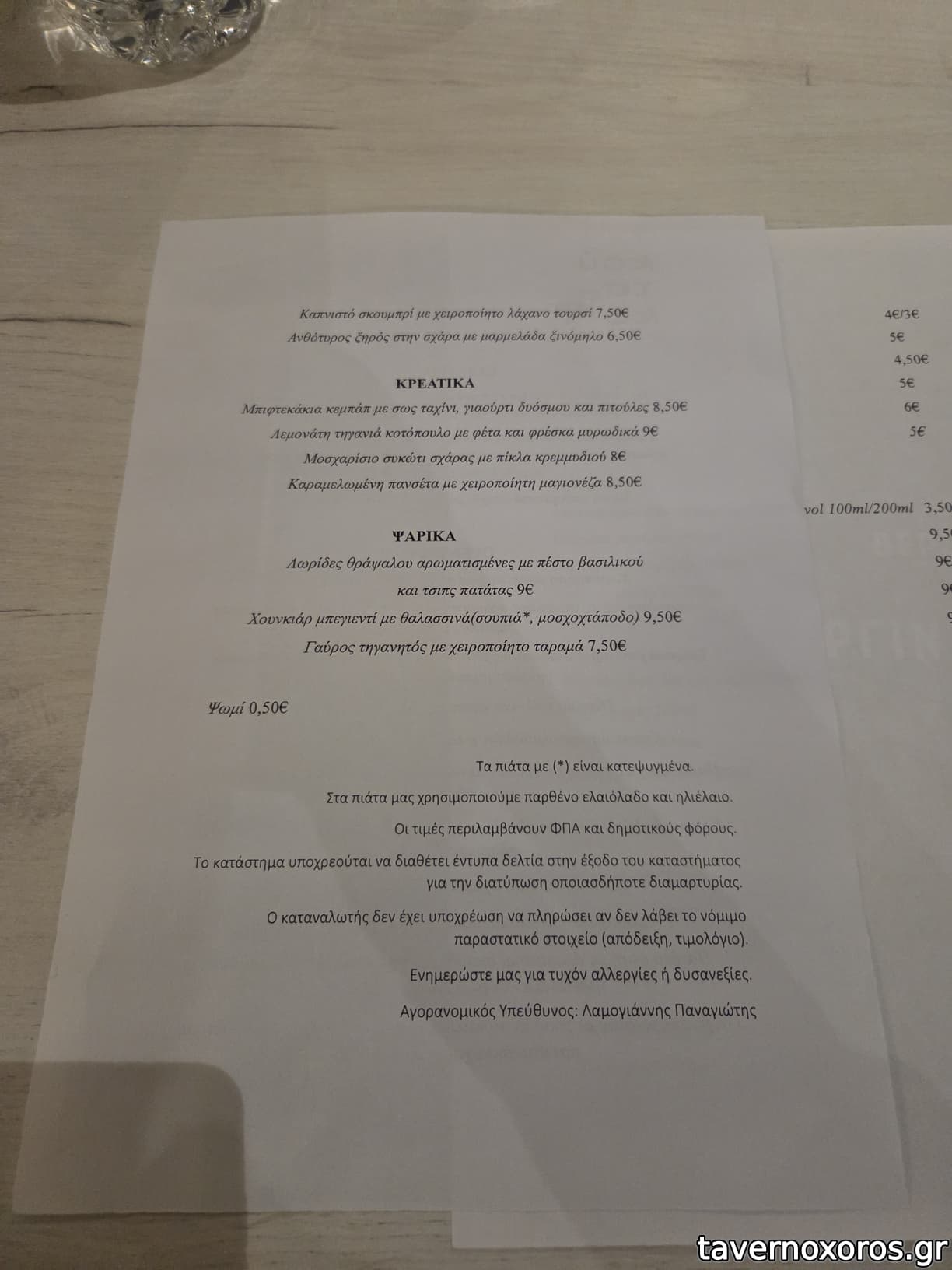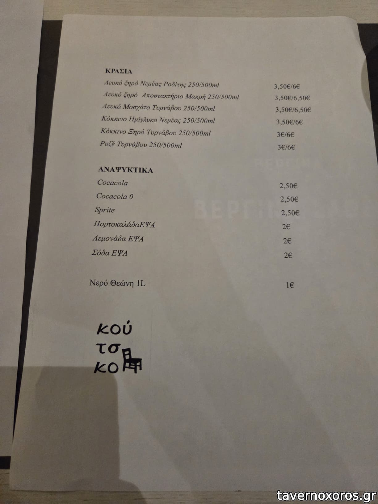 Την πρώτη φορά δοκιμάσαμε το χύμα τσίπουρο, πολύ καλό, και ένα λευκό που δεν μας άρεσε. Την δεύτερη φορά τα παιδιά μας είπαν πως το λευκό κρασί αντικαταστάθηκε από αυτό του ίδιου παραγωγού με το τσίπουρο, αρκετά ξηρό και πολύ καλό, καμμία σχέση με το άλλο και μπράβο τους.