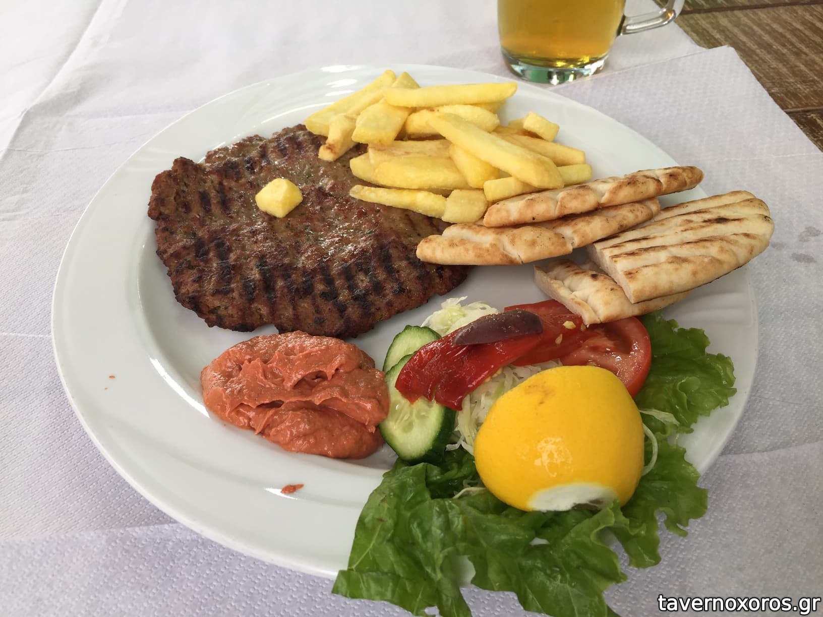 Μόλις πήγαμε στο άτομα μας λέει ο ιδιοκτήτης : θα σας φέρω μια μερίδα μπιφτέκι και μια σνίτσελ κοτόπουλο. Μην πάρετε τίποτα άλλο τα έχουν όλα.